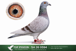 .LOT 4 EXCLUSIVE AUCTION -SA 26 0594 – Bred by Pigeon Palace Very well bred, a son from the most successful line of Goed Grijs, namely Wondere van Goed Grijs, crossed with a 95/Beauty, a fantastic daughter out of “Special Kittel” and the 95 hen. Super quality.————-SIRE:BELG-24-4174468 “Albert” (PIPA) “Albert” is a direct son of the world-famous ‘Wonder van Goed Grijs’, one of the most exceptional breeding lines ever produced by PIPA. He is a very special breeder, already proving his class early by siring 25x Top 1% winners in 6 different lofts in his first year of breeding — an extraordinary achievement. He is also a son to a daughter of ‘Grizzle Best Kittel’, regarded as one of the best racing cocks ever owned by Daniel Dehon and one of Belgium’s greatest sprint phenoms. This makes “Albert” a double powerhouse of PIPA and Best Kittel genetics, combining elite sprint performance with proven breeding strength. He is currently one of the most sought-after breeding pigeons on PIPA.—————DAM:JWDK-24-4099 H ’95 Beauty’ Pigeon Palace Red Pied.Super special hen bred from the best Kittel pair in SA ! Full sister to 63384/18&63390/18 Alwyn Bester. ‘63384 g/f to Turbo Kittel SANPO Gold medal & 3rd world allround best bird. G/f to 9060/20 2nd Ace middle distance. union. Sire 604/22 1st Gauteng Combine Noupoort 23 & double PTA union winner also ace pigeon overall. ‘63390’ sire to ‘Dynasty’ grand averages winner Dinokeng OLR ’22 also 343/21 union winner Verkeerdevlei & 344/21 R100 000 B/s winner Crusaders.SEE PEDIGREE!!!