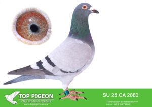 .LOT 6 EXCLUSIVE AUCTION – IHUS 25 S 082937 – Victor is inbred to one of Derek’s best ever breeder that is now in China, namely “Golden Blauwe Lady”. – a perfect example of Dirk Van den Bulck cross with “Di Caprio Lines”. Famous for success in One Loft races worldwide.——————SIRE: “SUPER ACE” (GB D-23-75455 C) Bred by Derek Walsh – Blue Cock “Super Ace” is an outstanding young breeding cock, originally retained for stock due to his exceptional pedigree and performance background. He represents some of the very best of the Derek Walsh and Van den Bulck lines. He is a direct son of “Blauw As” (BE 13-6139759) – a brilliant racer and breeder from Marina Struyf, responsible for top results including multiple Quiévrain winners, and closely related to the legendary “Kittel” line. On the dam side, he is out of “Golden Blauw Lady II” (GB V-21-95095) – a fantastic daughter of the original “Golden Blauw Lady”, one of the most proven breeding hens in the loft. She is a direct link to the famous Di Caprio bloodline, known worldwide for One Loft Race success. “Super Ace” carries elite genetics, combining performance, consistency, and world-class breeding power — making him a top-class sire with massive future potential.—————–DAM: “LADY VICTORIA” (GB V-21-94985 H) Bred by Derek Walsh – Blue Chequer Hen “Lady Victoria” is a proven winner and exceptional breeding hen, combining top race performance with elite genetic strength. She is a winner of: 3rd Federation 1,782 pigeons Arrived with the winner She is a direct daughter of “Maximus II” (GB 18-V60665) – a top Dirk Van den Bulck cock and proven breeder, responsible for numerous Federation winners and top positions. Her dam is the outstanding “Miracle Lady” (IHU 17-S003506) – one of the loft’s best breeders, a hen that consistently produces winners and top performers at Federation and National level. She is also a direct daughter of “Super Blue Max”, further strengthening the Van den Bulck influence.SEE PEDIGREE!!!!