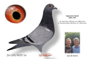 LOT 23 SURPRISE AUCTION – ZA 24 GPU 9037 -SIRE:7993 ZA 22 HPT. Alias “JB X HG LAST SON” Strain: Danie Scholtz Color: Blue Bar ZA HPT 7993 ’22 “JB X HG LAST SON” full Brother to DREAM, who bred ZA BPF/D 0694 ’18 LINDIE equal final winner Sonskyn OLR 2019, 663km vel. 1186, 50th Ace Bird. DREAM bred ZA HPT 3523 ’19 CARLADA equal winner hotspot 3, Victoria Falls World Challenge Pigeon Race 2020, winning $4000. DREAM bred ZA NKHP 5655 ’20 VICTORIA winner of Ninth Race Penultimate at Diaz One Loft 2021, 197km, vel. 1455 m/min. DREAM is grandmother to ZA BPF 934 ’21 MISS NAVIGATOR, Bakkie Winner.———-DAM:7963 ZA 22 HPT.Alias “APPLESTAR 10150” Strain: Danie Scholtz Color: Blue Bar ZA HPT 7963 ’22 bred from our best Tom Lock’s. Sire, ZA 10150 ’16 bred HOPE, 18th place, Hotspot 2, Central Provincial Lofts 2020, 320km, vel. 1330 m/min. ZA 10150 ’16 bred VICTORIA Winner of Nineth Race Penultimate at Diaz One Loft 2021, 197km, vel. 1455 m/min. VICTORIA’S nestmate sister STORMKIND, dam to ZA SANPO 13142 ’22 JEANNIE final equal winner Dinokeng One Loft Race 2023 for Gerber & Koutsoudis.SEE PEDIGREE!!!