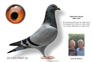 LOT 21 SURPRISE AUCTION – ZA 24 GPU 9347 -SIRE:9534 ZA 23 GPU.Strain: J Faul & DJ Scholtz Color: Blue Bar Bred from our best Tom Lock X Sablon Genetics. Sire, SON NO 1 COCK, superbreeder for J Faul & DJ Scholtz. He is Sire to ZA CRU 1361 ’22, rung with R5000 Crusaders ring, won R62 500 in 2023 from Middelburg, 710km, 1519 m/min velocity. ZA CRU 1361 ’22 bred by J Faul & DJ Scholtz, raced by Alwyn Bester & IP du Preez in a very strong Crusaders Club. Full Brother, ZA GPU 11958 ’20 BEST LONG DISTANCE GPU, 2nd Best Long Distance bird GPU 2021, and Best Long ———–DAM: 9984 ZA 23 GPU .Alias “PILOT EYE SISTER” Strain: J Faul & DJ Scholtz Color: Blue Check ZA GPU 9984 ’23 PILOT EYE SISTER, full sister to PILOT EYE, 4th ACE bird OLR Dinokeng 2020. Positions flown: HS1: 904, HS2: 51, HS3: 5, HS4: 132. Main race, Gariep Dam, rank: 34, 624km, 1646 m/min Barzalona race – Gariep Dam, rank: 8, 624km, 985 m/min PILOT EYE SISTER aunt to MISS NAVIGATOR, Bakkie winner for JJJ vd Linde.SEE PEDIGREE!!!