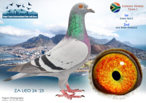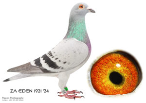 LOT 20 CORRIE NAUDE – ZA 24 EDEN 1947 -SIRE:28235 ZA 16.Inbred Houben-Clausing His father is Vinkie and he is a Grandson of Ziko SA who bred my Houben-Clausing winning pigeons. This cock bred us 5 times wining positions. All the birds out of this cock can be put to stock. Bred 3rd place ERPF winner from Kimberley (650 km).————DAM:7798 ZA TRPF 20 Houben-Clausing MIEL Houben-Clausing Houben-Clausing inbred bird. This hen also breed winners with different cocks. A great hen. Mother to a ERPF federation winner. 1st place ERPF federation winner from Groblershoop (580 km).SEE PEDIGREE!!!!