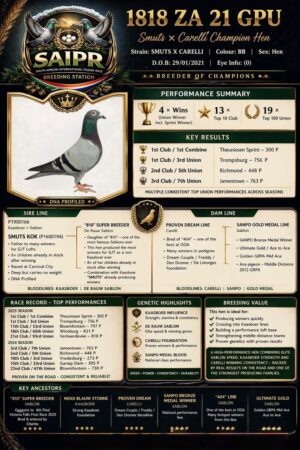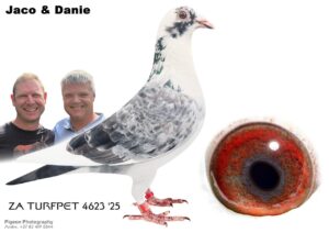 .LOT 8 DANIE SCHOLTZ / JACO FAUL – ZA 25 TURFPET 4623 -Bred from a power-packed double “Texas Gold Dust” pairing, this cock is a direct product of one of the most proven Dirk Van Den Bulck-based breeding combinations currently available. Both Sire and Dam are full siblings – direct children of the elite pairing “TEXAS” x “DOUBLE GOLD DUST III”, making this pigeon a tight inbred line to GOLD DUST and KITTEL bloodlines. The foundation of this pedigree is exceptional: “PADELI” – super breeder, son of “Brother Goede Rode” x “Golden Leo 9999” “GOLD DUST” – world-renowned as the best breeding sister to KITTEL “DOUBLE GOLD DUST III” – double grandchild of GOLD DUST “TEXAS” – direct from Marcel Sangers, carrying the best of Bulck genetics On both sides of the pedigree, you find a concentration of elite producers, including: Brother Goede Rode Golden Leo 9999 Best Kittel (1st National Ace Sprint) Angelina Skittel Gold Dust This makes ZA 25 TURFPET 4623 a genetically stacked inbred breeding prospect, specifically designed for stock, with: ✔ Proven Bulck/Kittel base genetics ✔ Strong linebreeding to GOLD DUST & PADELI ✔ Multiple generations of top breeders and Ace-producing lines 👉 A serious stock pigeon, bred with one goal: to reproduce winners consistently at the highest level.SEE PEDIGREE!!!!