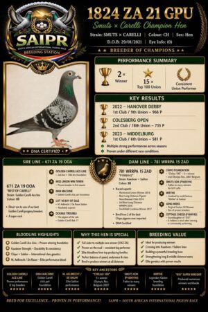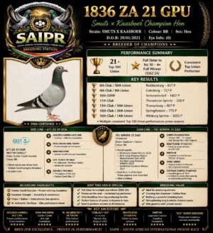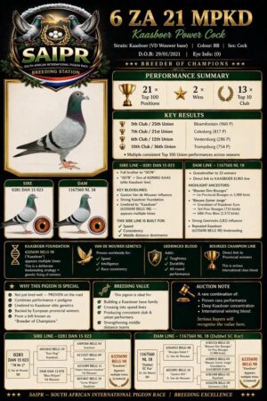 .LOT 1 KITTEL AUCTION – SA 26 0592 -SIRE:JWDK-24-4002.’95/02′ Pigeon Palace Dark Check Bred from the most successfull Kittel pair in South Africa! Full brother to 63384/18&63390/18 Alwyn Bester Lofts. Responsible for amazing results over the last 3 years. ‘63384 g/f to Turbo Kittel SANPO Gold medal & 3rd world allround best bird. G/f to 9060/20 2nd Ace middle distance union. Sire to 604/22 1st Gauteng Combine Noupoort ’23 & double PTA union winner also ace pigeon overall. ‘63390’ sire to ‘Dynasty’ grand averages winner Dinokeng OLR ’22 also 343/21 union————————–DAM:ZAGJT-23-117 H ‘Chipo 117’ Kaasboer-Chipo. This pigeon was racing as a SAIPR tracker pigeon. Flew in front pack all the way. Up until hotspot 2 this pigeon were leading the hotspot averages. Best from Kaasboer x Chipo lines in this beautiful little hen.SEE PEDIGREE!!!