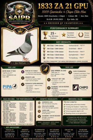 .LOT 4 PIGEON PALACE -SA 26 0591 -SIRE:JWDK-24-4002.’95/02′ Pigeon Palace Dark Check Bred from the most successfull Kittel pair in South Africa! Full brother to 63384/18&63390/18 Alwyn Bester Lofts. Responsible for amazing results over the last 3 years. ‘63384 g/f to Turbo Kittel SANPO Gold medal & 3rd world allround best bird. G/f to 9060/20 2nd Ace middle distance union. Sire to 604/22 1st Gauteng Combine Noupoort ’23 & double PTA union winner also ace pigeon overall. ‘63390’ sire to ‘Dynasty’ grand averages winner Dinokeng OLR ’22 also 343/21 union————————–DAM:ZAGJT-23-117 H ‘Chipo 117’ Kaasboer-Chipo. This pigeon was racing as a SAIPR tracker pigeon. Flew in front pack all the way. Up until hotspot 2 this pigeon were leading the hotspot averages. Best from Kaasboer x Chipo lines in this beautiful little hen.SEE PEDIGREE!!!