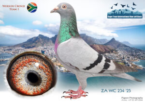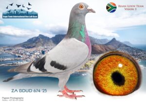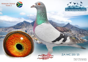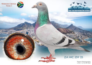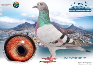 ZZ..LOT 104 CAPETOWN LOFTS – Jones Family-ZA-JFL-25-5757″””—“INJURED” DID NOT GO TO THE FINAL—SIRE:ZA 22 JFL 2578. JONES FAMILY BLOODLINES. 1ST COMBINE 300 MILES. BRED FROM SUPER GENETICS AROUND THE WORLD.————DAM:225 ZA 20 HOBY. GANUS/ALFONS KLAAS. SIRE IS BRED DIRECTLY OUT OF SUPER PAIR “ORNAT” AND “SOARAIA”.SEE PEDIGREE!!!!