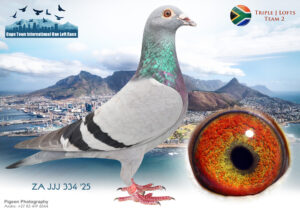 LOT 96 CAPETOWN LOFTS – Triple J Lofts Team 3-ZA-JJJ-25-340*** —21st HS1, 6th HS2, 3rd HS3, 15th HS4 !!!! 2nd Ace Bird prior to Final !!!—-Sire: ‘TOMMY’ ZA 2023 JJJ 107 Notes: TOMMY (completed 2024 Carnival Gold Cup) in his first breeding year bred two super racers in the 2025 Cape Town Summer Series – JEER & JUSTIFY – 1st & 2nd ‘Hot Spot’ Ace Pigeons after Hot Spot 4!!! ~ JEER (ZA 25 JJJ 69) –1st 2026 Cape Town Int Pigeon Race Hot Spot Ace – 9th HS 1 (175km), 24th HS 2 (225km), 15th HS 3 (275km) & 36th HS 4 (325km) ~ JUSTIFY (ZA 25 JJJ 340) – 2nd 2026 Cape Town Int Pigeon Race Hot Spot Ace 21st HS 1 (175km), 6th HS 2 (225km), 3rd HS 3 (275km) & 15th HS 4 (325km)————Dam: ‘BELLE’ ZA 2021 JJJ 307 Performance: BELLE was a SUPER racer at the 2022 Allflight Gold Cup Summer Series, winning: 4th Gold Cup Final! 2nd Ace Bird!! 5th Hot Spot 1!! 4th Hot Spot 2!! Belle was also mother of Jordy (13th 2022 Cape Town Summer Final)!SEE PEDIGREE!!!!