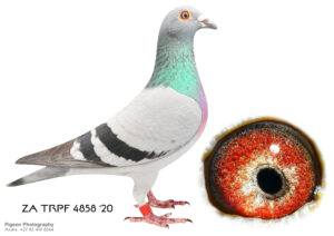 LOT 25 CORRIE NAUDE – ZA 20 TRPF 4858 -SIRE:29737 ZA 15.Sanpo Gold Medal Pair The father is Seabiscuit who was the SANPO Gold Medal winner. The best bird over all distances. Mated to Hetti. One of the best Million Dollar Race pigeons, bred out of Gabi Vandenabeele bloodline. The legendary Wittenbuik cock in Belgium.———DAM:3036 ZA GPU 18 Gold Medal BBPD Sanpo Gold & Silver Medal Pair Short Dis The Sire of this hen is a Spritzie Jansen Cock and 3 x winner. Best pigeon in the WRRPA and one of the SANPO Gold Medal Short Distance winners. The Dam of this hen is my SA National Pigeon Organisation Silver Medal Winner Short distance 2013.SEE PEDIGREE!!!!