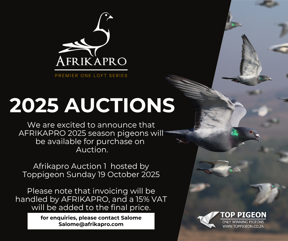.LOT 1 AFRIKAPRO AUCTION 1 – Pigeon Palace 2-ZA-24-JWDK-4189 -RACE 3 EQUAL WINNER , 9TH RACE 4 EQUAL WINNER—–‘Solana’ Pigeon Palace RCH Excellent performer at Afrika Pro ’25. Sibling ‘Fiero’ 2nd Final Afrika Pro ’25 601 km. Co-winner race 9 @ 500 km.——Half sibling to ‘Lara’ phenomenal record breaking racing machine at Afrika Pro 2025. 1st Ace pigeon overall (Blue Jacket) 1st Ace pigeon long distance (Brown Jacket) 3rd final race 601. km 1150 mpm. Sire to ‘Fiero’ 2nd final race 2025 Afrika Pro 601km———SIRE:ZAABL-24-1458 C ‘Palace Prince’ Kittel-Di Caprio Mealy Pied Inbred to ‘Special Kittel’ and the ’95 hen’. Bred from a super performing family of pigeons..Sire to legendary ‘Lara’ phenomenal record breaking racing machine at Afrika Pro 2025. 1st Ace pigeon overall (Blue JACKET) 1st Ace pigeon long distance (Brown Jacket) 3rd final race 601 km 1150 mpm. ———-DAM:ZA-18-82875 H ‘Super Twilight’ Kings & Gys Louw. Super racer middle to long distance. Bred from a line of SANPO Gold medal winning pigeons. This hen’s first baby was a double winner 1st & 2nd union against more than 1500 pigeons. In her bloodline we find Gauteng combine winners and best birds. One of our top hens!SEE PEDIGREE!!!