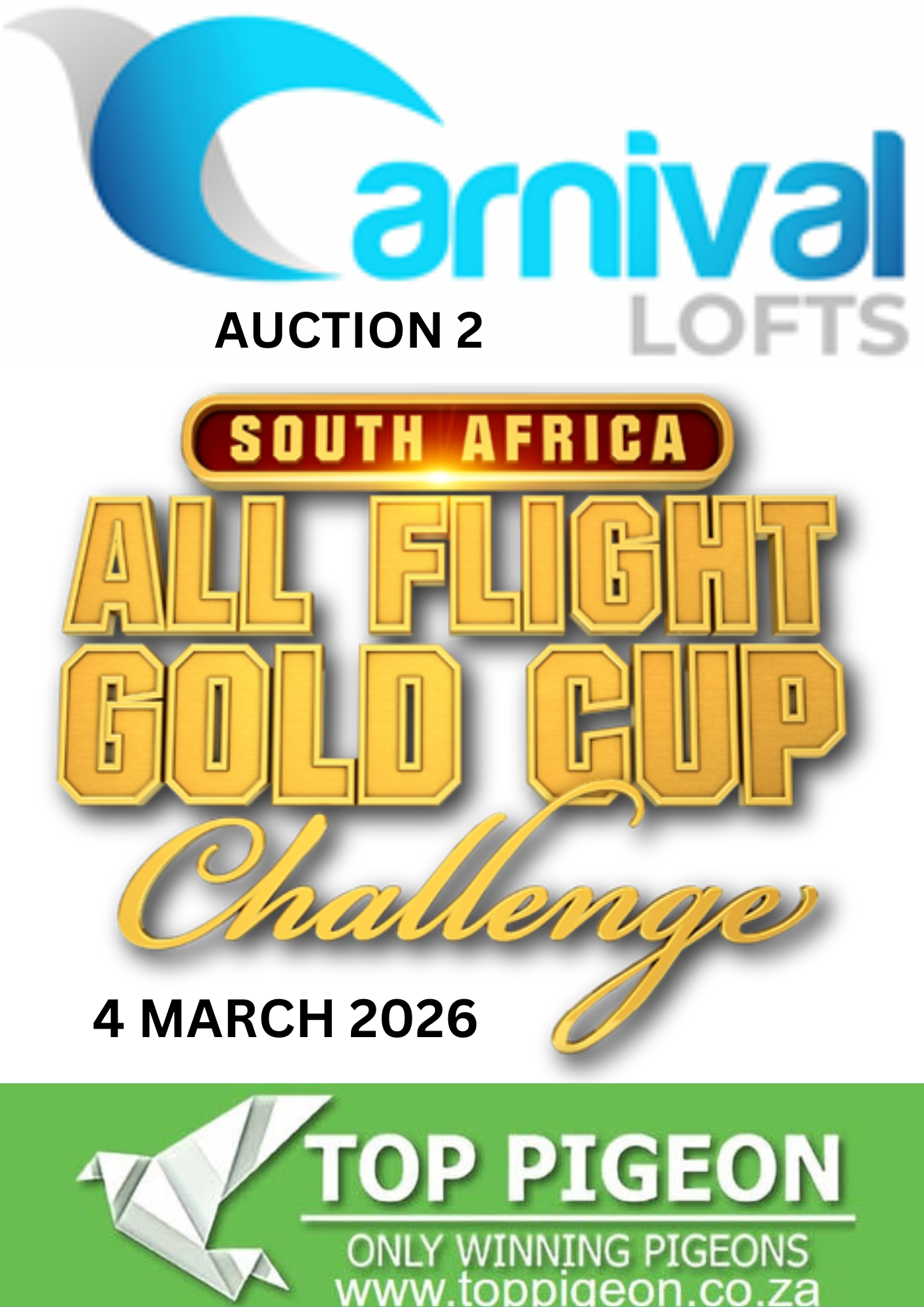 .LOT 1 CARNIVAL ALL FLIGHT GOLD CUP AUCTION 2 – Sterkfontein/Dieplaagte – DPL 25 523 – 5TH FINAL WINNING R25 000.00–5TH ACE BIRD WINNING R10 000.00———-SIRE:ZA-2021-DPL-39 Dieplaagte & Sterkfontein Lofts Blue Half-brother to “Soetdoring 21” • 2e Final Central Prov. Lofts 2021. • 7e Hotspot 5 Central Prov. Lofts 2021. Half-brother to “Sky Wing” • 1e Knock-Out Central Prov. Lofts 2022. • 1e Open Ace Central Prov. Lofts 2022. • 8e Open Final Central Prov. Lofts 2022. • 49e Car Race Central Prov. Lofts 2022. =================DAM:ZA-2024-DPL-411 Dieplaagte & Sterkfontein Lofts Checkered • 11e Ace Carnival Summer 2025. • 12e Hotspot 3 Carnival Summer 2025. • 24e Hotspot 2 Carnival Summer 2025. • 29e Final Carnival Summer 2025. • 70e Hotspot 1 Carnival Summer 2025.SEE PEDIGREE!!!