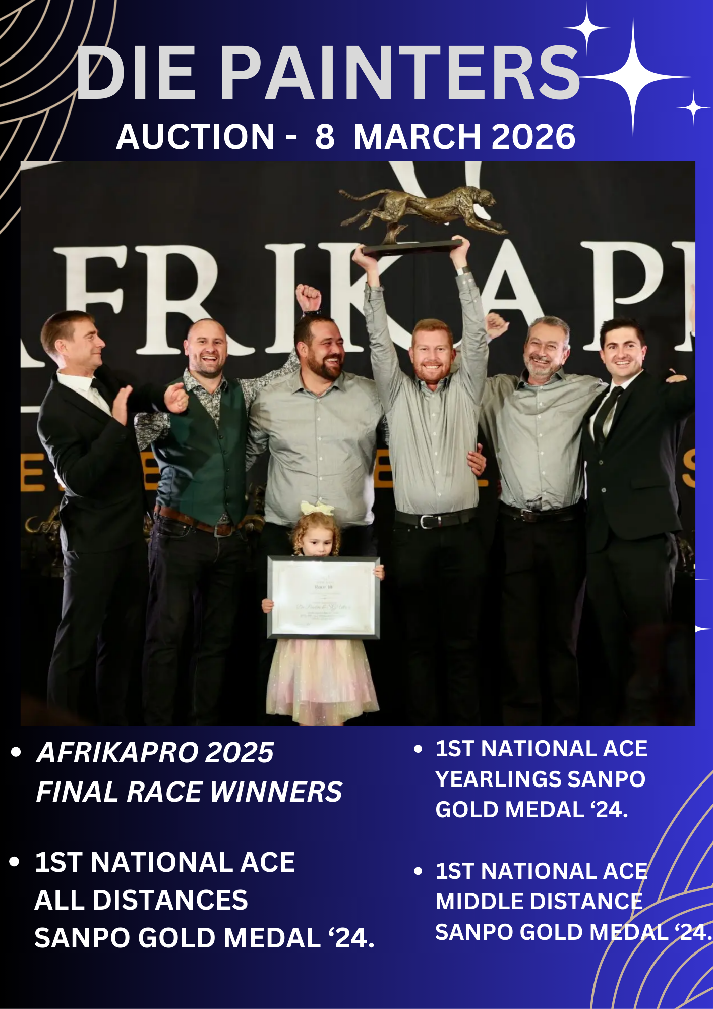 .LOT 3 DIE PAINTERS – ZA 26 KPU 4567 -“CREME DE LA CREME” Painter NG Ch Out of two proven breeders of Union & Combine Winners! This is one of our “RECIPE PAIRS” that has brought us so much joy over the last few years. Father is “LONGOLD” our Sanpo Gold Medal Winner Long Distance 2022.. This cock is not only a super racer but produce two winners in his first nest – both babies being Top 1% Union performers. Mother is a daughter of the best pigeon we have ever owned – the legendary “17 X Winner” is mother, grandmother and g/gmother of our worldclass family that have produced the Afrikapro Final Race Winner, Afrikapro Green Jacket Winner, Afrikapro Blue Jacket Leader, Afrikapro Brown Jacket leader and 17 Sanpo Merit Awards The progeny of the mix of the bloodlines of the “17 X WINNER”, “KONING KAAS” and “THE FAMOUS SK HEN” has won more than 500 races over the last 8 years right across South Africa and as far as Scotland. They have proven that they canbeat the best the world has to offer at Afrikapro – not only once but on multiple occasions.SEE PEDIGREE!!!!