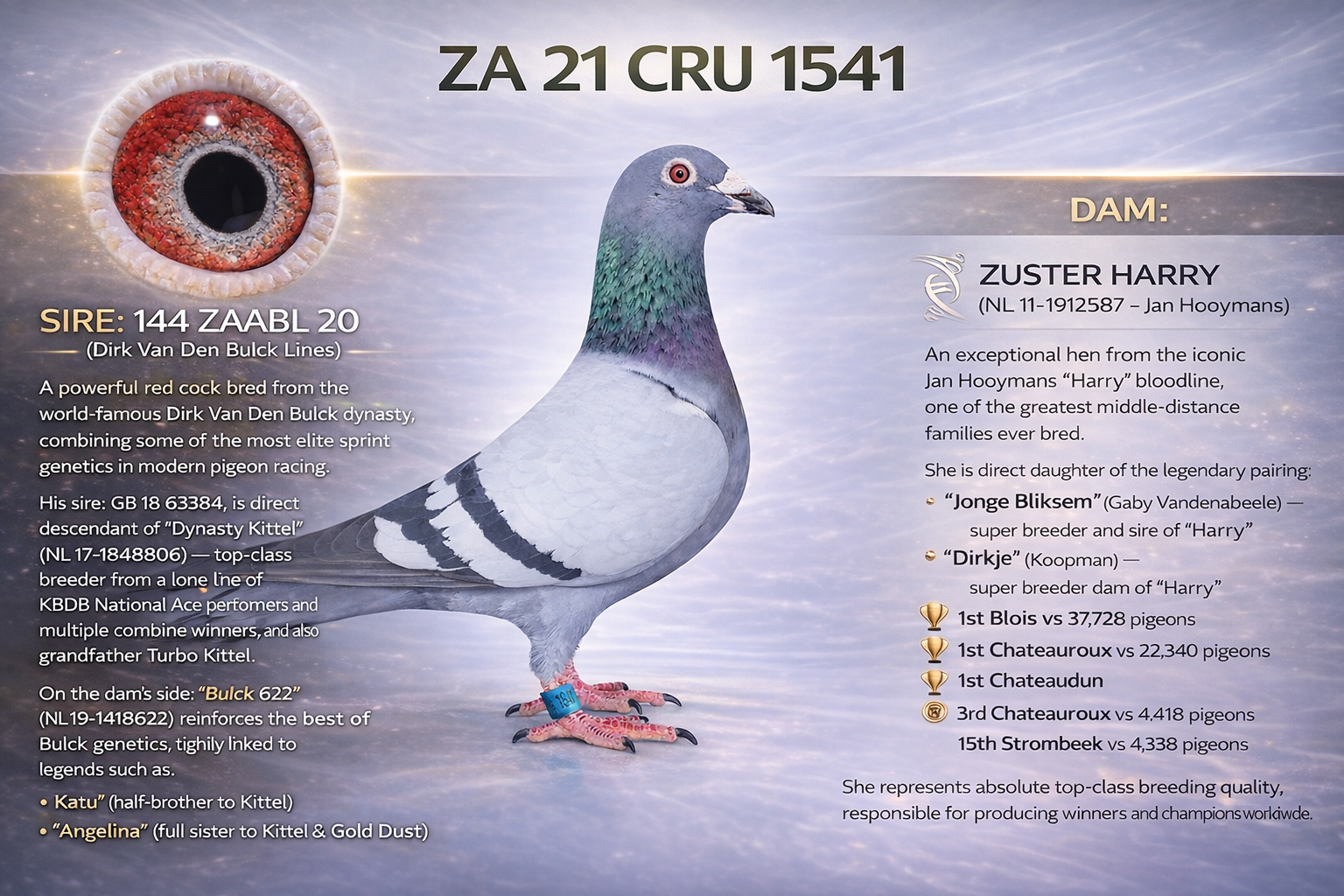 .LOT 1 DIRK VAN DEN BULCK / ZUSTER HARRY – ZA 21 CRU 1541 -SIRE:144 ZAABL 20. DIRK VAN DEN BULCK. ABL 144 SOLD FOR R29 000.00 ON TOPPIGEON.SIRE IS SUPER BREEDER KITTEL COCK OF ALWYN BESTER AND ALSO GRANDFATHER TO “TURBO KITTEL” 8 X SANPO MEDAL WINNER.————-DAM:1912587 NL 11 ZUSTER HARRY Colour: BB JAN HOOYMANS HARRY SUPER PERFORMER 1ST BLOIS 37727 PIGEONS 1ST CHATEAROU 22340 PIGEONS 1ST CHATEAUD 3DE CHANTENROU 4418 PIGEONS 15TH STROMBEEK 4358 PIGEON21ST CHATEAUROU 5496 PIGEONS.SEE PEDIGREE!!