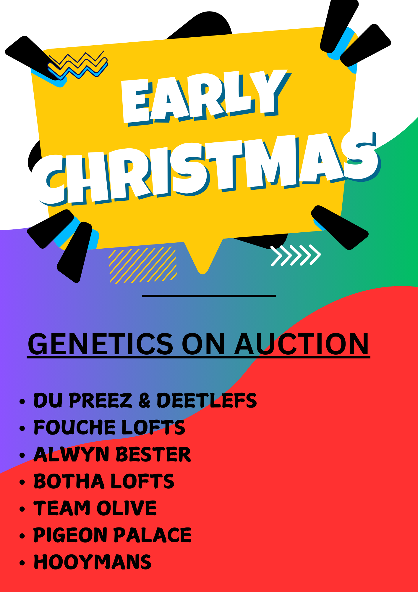 .LOT 1 EARLY CHRISTMAS – ZA 23 J&B 487 ——BRED BY DU PREEZ & DEETLEFS—–SIRE:9059 PWDU 20.(SOLD FOR R247 000.00 ON TOPPIGEON)WINNER BROTHER 9849 8 X SANPO MEDAL WINNER BEST BIRD UNION AND CLUB BEST MIDDEL DISTANCE BIRD AND WON 5XTIMES IN FIRST YEAR 9059 SCORED 3XTIMES FIRST 10 IN CLUB BEST BIRD CLUB 2022 COEFFICIENT SCORED .———–DAM:540 EC/DIAS 17 BREAKTROUGH Colour: LC OSWALD/PIETSTEENKAMP.SEE PEDIGREE!!!