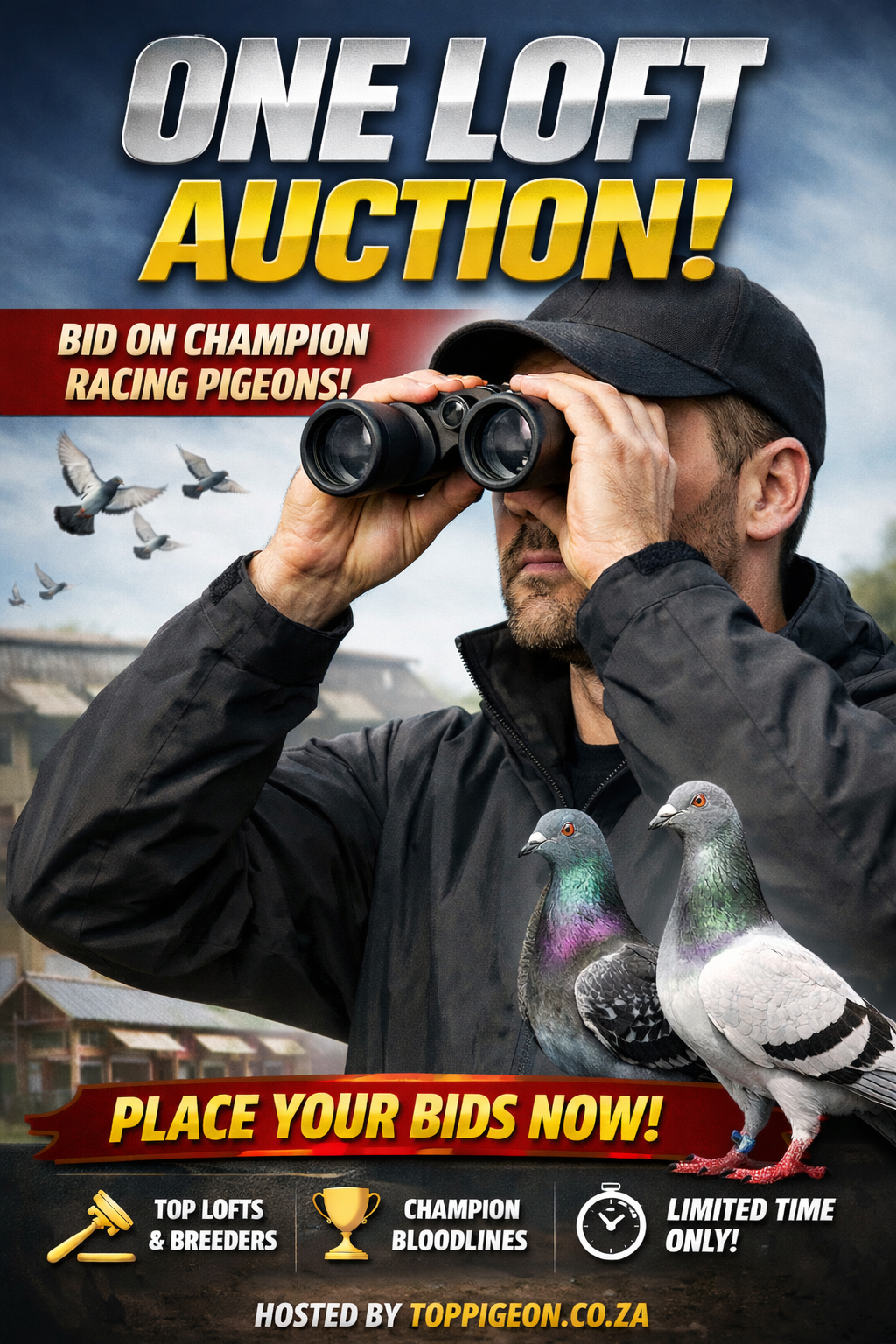 .LOT 2 ONE LOFT AUCTION – ZA NSPES 24 1 -HOTSPOT 1 WINNER , 11TH FINAL —-(WHEN MATED TO LOT 3 THEY BRED 20TH FINAL SAIPR SUMMER 2026 AND 8TH HOTSPOT 3 EQUAL WINNER)—–SIRE:ZA-2020-OAKD-2209 David Robinson Blue Father to multiple winners. ZA-2021-NWKD-003 • 1st Federation with 26 minutes. ZA-2024-NSPES-2 • 2nd Hotspot Ace Saipr Summer 2025. • 4th Grand Ave. Saipr Summer 2025. • 11th Final Saipr Summer 2025.———–DAM:ZA-2020-NWKD-373 David Robinson Bont Mother to multiple winners. ZA-2021-NWKD-003 • 1st Federation with 26 minutes. ZA-2024-NSPES-2 • 2nd Hotspot Ace Saipr Summer 2025. • 4th Grand Ave. Saipr Summer 2025. ZA-2021-NWKD-022 • 1st Federation old with 12minutes.SEE PEDIGREE!!!!