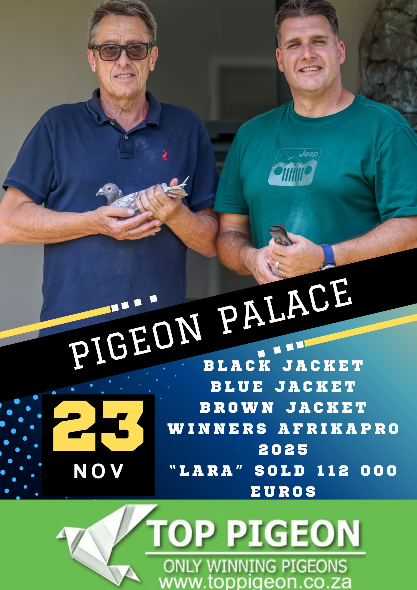 .LOT 1 PIGEON PALACE – ZA 25 TPA 7161 -Red Apollo’ Pigeon Palace RCH Halfbrother to: Lara Phenomenal record breaking racing machine at Afrika Pro 2025. Sold for 112 000 euros a South African record! 1st Ace pigeon overall (Blue Jacket) 1st Ace pigeon long distance (Brown Jacket) 3rd final race 601 km 1150 mpm Best racer in the history of the Afrika Pro series. Fiero 2nd Final Afrika Pro 25. Sold for 18 000 euros. Co-winner race 9 from 500 km. Co- winner Final 601km !—————-SIRE:ZAABL-24-1458 C ‘Palace Prince’ Kittel-Di Caprio Mealy Pied Inbred to ‘Special Kittel’ and the ’95 hen’. Bred from a super performing family of pigeons..Sire to legendary ‘Lara’ phenomenal record breaking racing machine at Afrika Pro 2025. 1st Ace pigeon overall (Blue Jacket) 1st Ace pigeon long distance (Brown Jacket) 3rd final race 601 km 1150 mpm.Sire to ‘Fiero’ 2nd final race 2025 Afrika Pro 601km.————-DAM:CRU-21-1316 H ‘New Animal’ Pigeon Palace.Sibling to 6th final Afrika Pro ’22 from 600 km. Beautiful hen & consistant racer. Bred from an excellent pair of pigeons.Gr/daughter legend ‘Number One’ grandsire to ‘Julia’ winner Afrika Pro final 600km in ’22. This hen is closely related to 2nd Final Victoria Falls OLR !SEE PEDIGREE!!!
