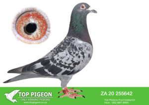 LOT 10 BARGAIN BOX – ZA 20 255642 – THIS COCK COMES FROM A SUPER MATING FULL OF SUPER STARS! THIS COCK IS BRED FROM A HALF BROTHER OF THE FAMOUS “WITOOG HEN” MATED TO HIS OWN DAUGHTER. THIS IS A COCK THAT HAS IT ALL – THE DAM:CONSISTANT RACER THEN STOCK / BRED FROM ACE BIRDS ONE DAY LOFTS / COMBINATIONS OF 1ST, 2ND, 3RD, 3TH, SAMDPR /” ROO” ACE BIRD ALLFLIGHT ODL DAVEY” OF SUPER BREEDER 410 CLAUSING & THE GOLDEN HEN DIRECT JEFF LUKE & NADIA HOUBEN/ ALL TOP OF THE RANGE FOUDATION GENETICS.I BOUGHT HER FOR STOCK – SEE PEDIGREE !!!