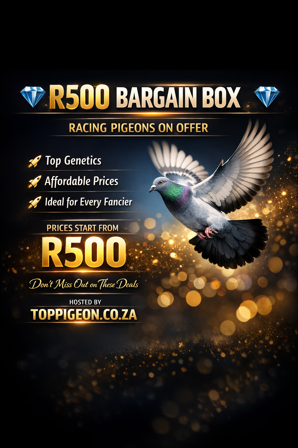 .LOT 8 BARGAIN BOX – ZA 25 TOPPIGEON 83 -SIRE:SIRE:ZA 15 TRPF/D 21922. Alias “22” Strain: Tom Lock Color: Blue Check This cock is off one of the best pairs to enter Mc Dermott Lofts and this cocks full sister TRPF 26202/14 is responsible for TRPF 15804/16 which was the Best Bird in the strong SRPC Club, Best Bird in division 3,2nd Best Bird in the mighty TRPF and Best Bird Overall in the strong Gauteng Combine, this hen was also the Best Short Distance and Best Middle Distance Bird in the strong Gauteng Combine.———-DAM:3759 ZA WPU 23 CH MARNES NEL 11th final and 10th Ace bird Carnival 2024. Father bred out of some of the original Houben/Clausings from Butch Einkamerer. The mother of this bird and the father of 3795, 7th place final, are brother and sister.SEE PEDIGREE!!!!