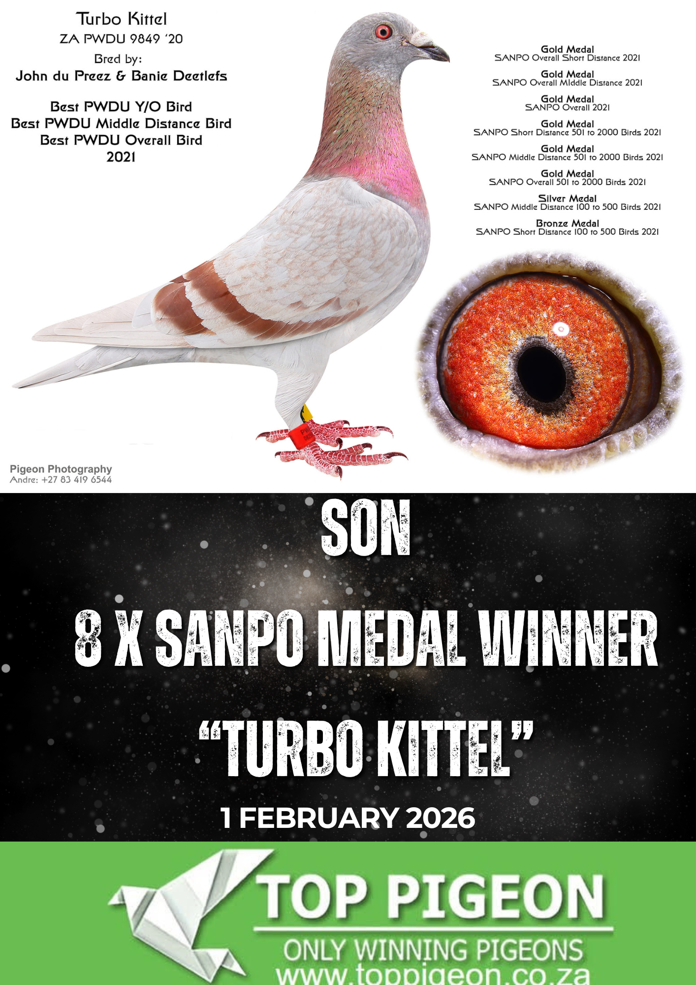 LOT 1 SON TURBO KITTEL – ZA 21 CRU 1557 BB COCK – DIRECT SON TO 8 X SANPO MEDAL WINNER “TURBO KITTEL” – SAME BRED SOLD FOR R132 000.00 , R126 000.00 , R108 500.00 – CRU 1557 BRED 6TH ACE BIRD DINOKENG OLR. EQUAL WINNER FINAL DINOKENG.-CRU 1557 DAUGHTER ALREADY BRED 2ND ACE AT CENTRAL PROVINCIAL ONE LOFT RACE———-SIRE:9849 PWDU 20 “TURBO KITTEL”. 5XWINNER IN FIRST YEAR BEST PIGEON IN SOUTH AFRICA 8 X SANPO MEDAL WINNER 6 X GOLD 1SILVER AND 1 BRONZE BEST YEARLING BIRD UNION BEST MIDDEL DISTANCE BIRD UNION.———–DAM:82478 ZA 18 Colour: BB Du Preez&Deetlefs 3 X WINNER BRED 14 WINNERS BEST OVERALL BIRD BEST SHORT DISTANCE BIRD BEST OPEN BIRD BRED 21-1150 – 3 X WINNER BRED 21-2684 – 3 X WINNER BRED 20-10077 – 3 X WINNER BROTHER -18 85015 – BRED 6 X WINNERS.SEE PEDIGREE!!