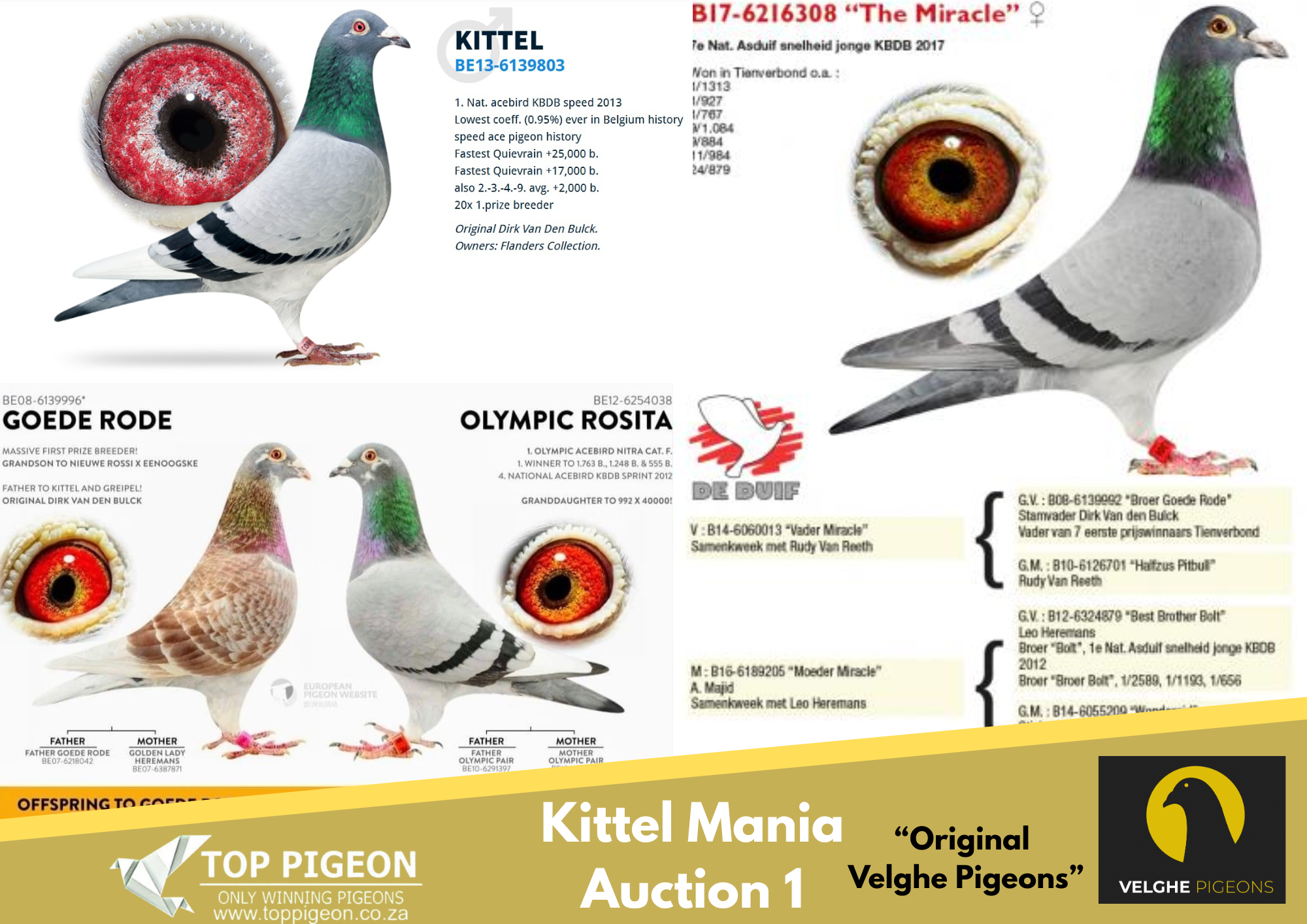.LOT 1 KITTEL MANIA AUCTION 1 – BE 24 3007680 BBAR -Best strain of Van den BULCK Dirk: – LA MACHINE – MIRACLE- LIBERAAL – OLYMPIC KITTEL – KITTEL———–SIRE:BE 22-6216159 M LA MACHINE 159. Van den Bulck Dirk. LA MACHINE won: 6.NAT CHAMP KBDB’18. 1.ACE COMBINE 2019. 7.ACE COMBINE 2018 .1. PRIZE 2.111 BIRDS .2. PRIZE 1.923 BIRDS. 2. PRIZE 255 BIRDS. 4. PRIZE 531 BIRDS. 6. PRIZE 643 BIRDS. 9. PRIZE 1.001 BIRDS. 14. PRIZE 2.502 BIRDS.————–DAM:BE 22-6216146 V MIRACLE X LIBERAAL .Van den Bulck Dirk .MIRACLE is father to -507/18: 22/1104, 26/1300 ,27/1262, 33/941, 28/621… -950/19: 1/1313 ,1/409 ,3/274, 3/268 ,11/4743 ,4/294, 9/1100, 17/1022… -958/19: 7/1100, 20/1314.SEE PEDIGREE!!!