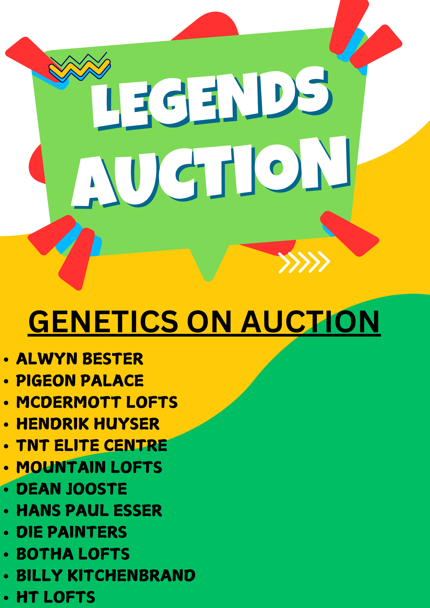 LOT 11 LEGENDS AUCTION – PIGEON PALACE – ZA 24 BENZ 3075 -SIRE:09297 ZA 14. TOP STOCK COCK MATED TO DAUGHTER OF MIRAGE.MIRAGE WERE SOLD FOR R69000.00 AND HIS HALF BROTHER CONCORDE SOLD FOR R138 000.00. AL BROTHERS AND SISTERS BREED WINNERS.————DAM:ZA 18 90753. DIRECT DAUGHTER TO MIRAGE.”MIRAGE” WERE SOLD THIS HEN WERE A TOP RACER AND WINNER OUT OF LEGENDARY MIRAGE WERE SOLD FOR R69000.00 AND HIS HALF BROTHER CONCORDE SOLD FOR R138 000.00. SEE PEDIGREE!!!