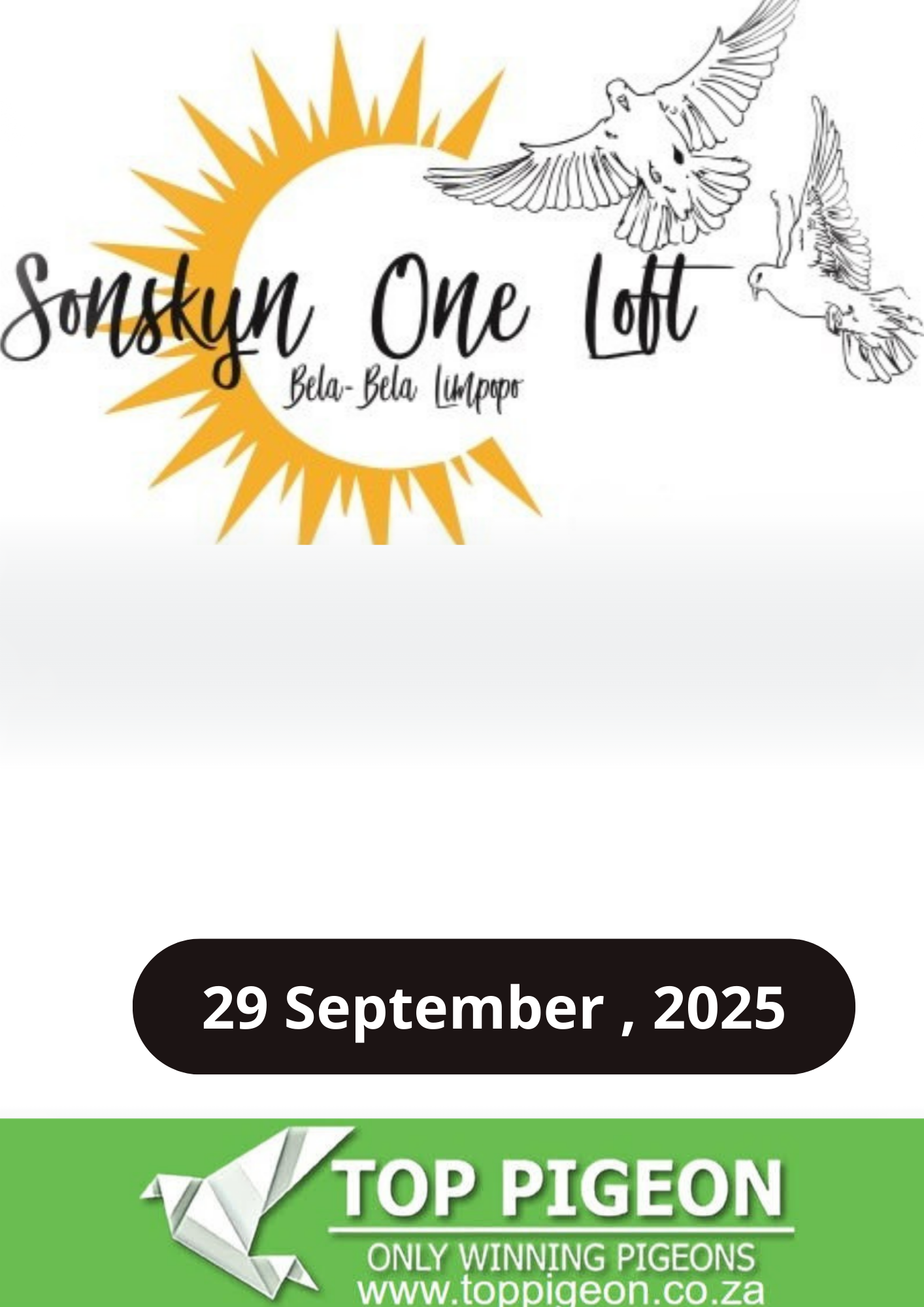 .LOT 4 SONSKYN OLR – J&G – ZA 25 OERF 2818 -Full sister to “Blue Moon” • 1e Ace Dinokeng Lofts 2025. • 1e Final Dinokeng 655km 2025—————SIRE:ZA-2019-GPU-14090.Father to “Evelyn” • 32e Race 2 (Equal Winner) • 12e Race 3 (Equal Winner) • 14e Race 4 (Equal Winner) • 19e Race 7 (Equal Winner) (Winning R10 000.00).———–DAM:ZA-2022-CYRL-365 Joe Gomes.ZA-2022-CYRL-365 Joe Gomes.SEE PEDIGREE!!!