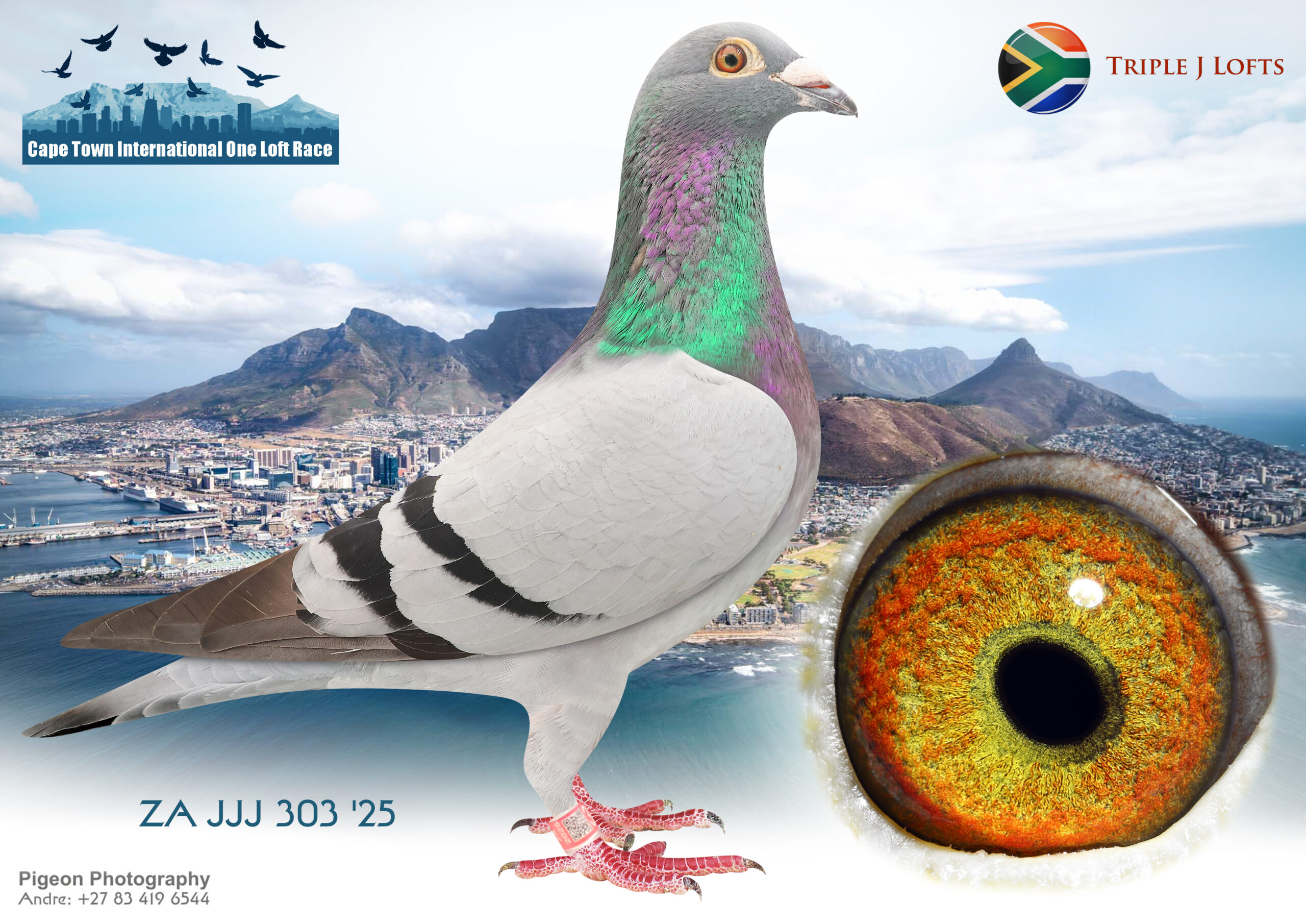 .LOT 1 CAPETOWN LOFTS AUCTION 3 – TRIPLE J LOFTS – ZA 25 JJJ 303 – 3RD ACE BIRD BEFORE THE FINAL——6TH HOTSPOT 1 EQUAL WINNER , 19TH HOTSPOT 2 EQUAL WINNER——–Sire: ‘ROMU JNR’ ZA 2017 Triple J Lofts 219 Notes: ‘ROMU JNR’ is Sire of: 1. JONIQUA a super racer at the 2023 Cape Town International Pigeon race: 6th Final 450km, 2nd Hot Spot 2 226km, 2nd Hot Spot 4 180km, 18th Hot Spot 1 175km! 2. JACK a super racer at the 2026 Cape Town International Pigeon race: 4 th Final 470km, 10th Hot Spot 4 325km, & 8tth Hot Spot 2 225km 3. JAKE – 83rd Pattaya 600km Final Endurance Race 4. TOMMY (completed 2024 Carnival Gold Cup) – TOMMY bred two super racers in the 2025 Cape Town Summer Series – JEER & JUSTIFY – who were the 1st & 2nd ‘Hot Spot’ Ace Pigeons after Hot Spot 4!!! ———-DAM:Dam: ‘LUZIA’ AU 2020 GFL 168 Notes: ‘LUZIA’ is full Sister THOMAS 6 – 1st Golden Algarve Final Race! 24 Minutes Against 2,132 Pigeons From 315 Miles!! SEE PEDIGREE!!!