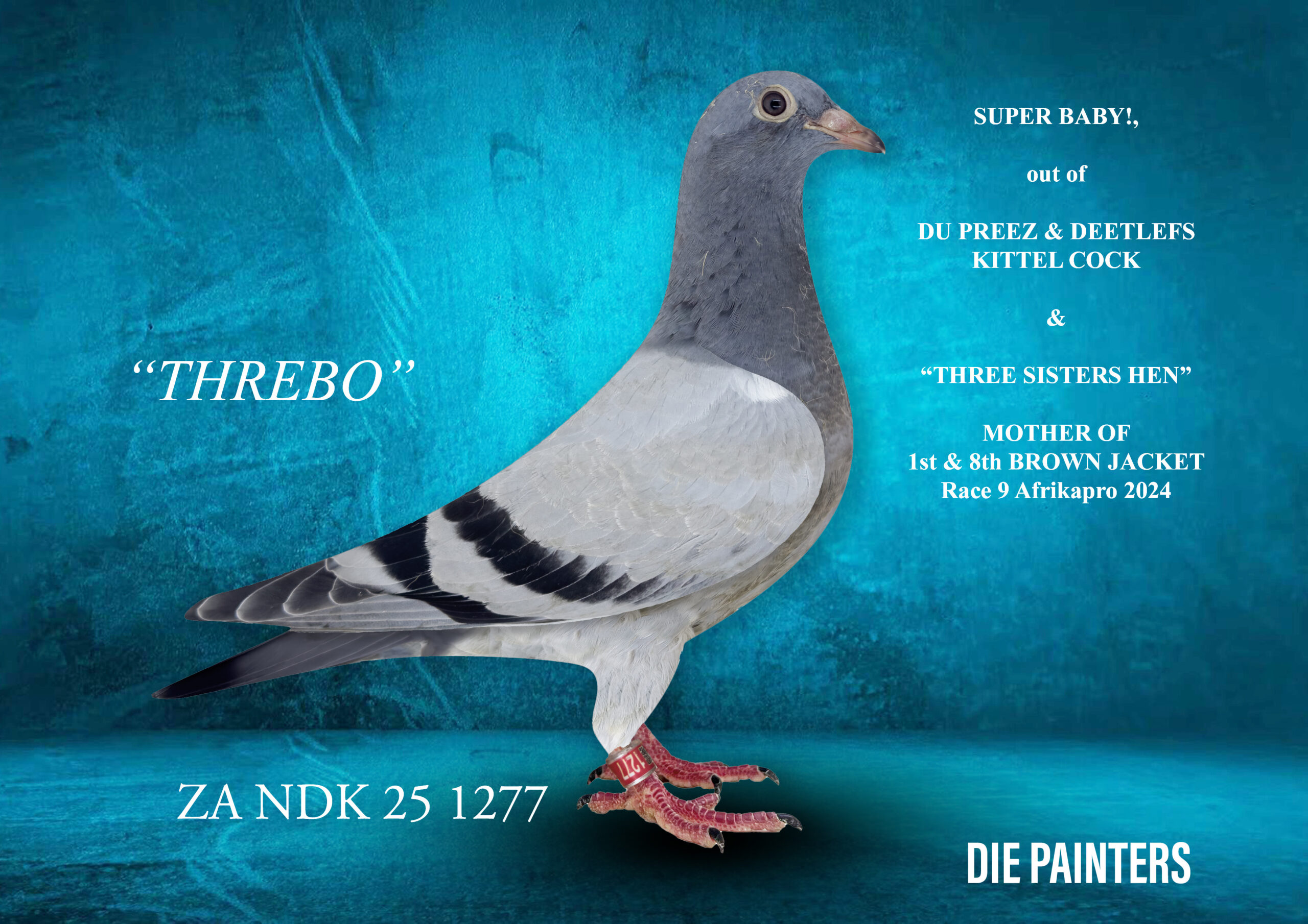 .LOT 1 DIE PAINTERS – ZA 25 NDK 1277 “THREBO” – Painter NG X Kittel Bb This is a sensational baby – we have already sent two similar bred babies to Afrikapro 2026. Bred out of a breathtaking cock from Du Preez & Deetlefs out of their super pair that bred two individual Sanpo Medal Winners. His parents were sold for more than R300k on their sale last year. The mother of this beauty is our superstar “THREE SISTERS HEN” – a direct daughter of our famous “DIAMOND PAIR” She is the mother of the two nestmate brothers “SIMON SAID WHIP” and “STEAR SAID WHIP” who ranked 1st & 8th Afrikapro Brown Jacket 2024 with one race to go. She is also mother to 6th Overall Ace Pigeon CPL and one of her other sons is a super breeder for Sufyaan Benjamin in Cape Town.SEE PEDIGREE!!!