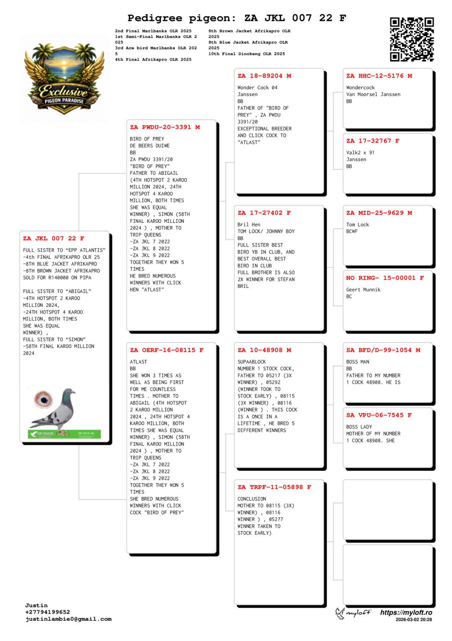 .LOT 1 WACKY WEDNESDAY- ZA 22 JKL 007 -ZA JKL 007/22 “EPP LIVVY”, FULL SIBLING TO: “EPP ATLANTIS” ZA JKL 1161/24: -8TH BLUE JACKEТ AFRIKAРО 2025 AGAINST 2900 PIGEONS -8TH BROWN JACKET AFRIKAPRO 2025 AGAINST 2091 PIGEONS -4TH FINAL AFRIKAPRO 2025, 601KM (1144MPM) THIS IS THE LAST SISTER ILL EVER SELL ONLINE OUT THIS PAIR. EXCEPTIONAL IS A UNDERSTATEMENT FOR THIS PIGEON, WOW THIS PIGEON IS AMAZING————-SIRE:ZA PWDU-20-3391 C BIRD OF PREY DE BEERS DUIWE.FATHER TO ABIGAIL (4TH HOTSPOT 2 KAROO MILLION 2024, 24TH HOTSPOT 4 KAROO MILLION, BOTH TIMES SHE WAS EQUAL WINNER), SIMON (58TH FINAL KAROO MILLION 2024), MOTHER TO TRIP QUEENS -ZA JKL 7 2022 -ZA JKL 8 2022 -ZA JKL 9 2022 TOGETHER THEY WON 5 TIMES.————DAM:ZA OERF-16-08115 H.SHE WON 3 TIMES AS WELL AS BEING FIRST FOR ME COUNTLESS TIMES. MOTHER TO ABIGAIL (4TH HOTSPOT 2 KAROO MILLION 2024, 24TH HOTSPOT 4 KAROO MILLION, BOTH TIMES SHE WAS EQUAL WINNER), SIMON (58TH FINAL KAROO MILLION 2024), MOTHER TO TRIP QUEENS -ZA JKL 7 2022.SEE PEDIGREE!!!