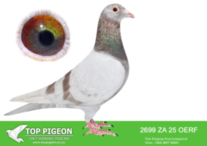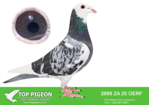 .LOT 6 HANNES TALJAARD – ZA 25 OERF 2689 -SIRE: 02820 ZA 16. Strain: Alwyn Bester Color: Cheque Pied Full brother to 09981/13, “CONCORDE”,SANPO GOLD MEDAL OVERALL 2015. I kept this cock to replace his famous brother in the stock loft after 09981 was sold to Ferdie Lubbe. A super handling pigeon..——————DAM: ZA 16 02836.Alias “SILVER EMBLEM” Strain: GOLD MEDAL LINE Color: BLUE CHECK PIED “SILVER EMBLEM” ZA16 02836. FULL SISTER TO CONCORDE- SOLD FOR R138,000 ON TOP PIGEON DAM TO 4 WINNERS INCLUDING PTACOMBINE WINNER ZA17 35631 FOR LOUIS BOTHA OF CRUSADERS CLUB 1ST CLUB, 1ST UNION,1ST PTACOMBINE WON BY 5MPM FROM DEWETSDORP 3 AGAINST 2001 YEARLINGS.SEE PEDIGREE!!!