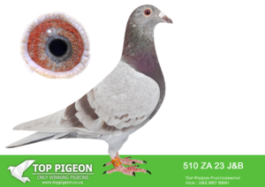 .LOT 3 HANNES TALJAARD – ZA 23 J&B 510 -SIRE:9060 PWDU 20.Du Preez&Deetlefs. 9060 – SOLD FOR R173,000.00. BRED WINNERS. 2 X WINNER .SUPER RACER. BROTHER 8 X SANPO MEDAL WINNER “TURBO KITTEL”2ND BESTMIDDEL DISTANCE BIRD UNION 2ND BEST MIDDELDISTANCE BIRD CLUB.———–DAM: ZA 21 CRU 1107. DU PREEZ & DEETLEFS. bred from a powerful mix of Turbo Tom / Putterie bloodlines, combined with top-performing stock from Du Preez & Deetlefs. She is closely linked to elite genetics such as: Hooymans x Vandenabeele crosses, known for producing winners at the highest level Proven union winners and best bird performers Strong long-distance and combine race performers On the bottom side, she traces to “HOPE” – winner of the Barzalona Dinokeng race, adding direct race-winning ability. The line also includes multiple Bakkie winners, confirming consistency and durability.SEE PEDIGREE!!!!