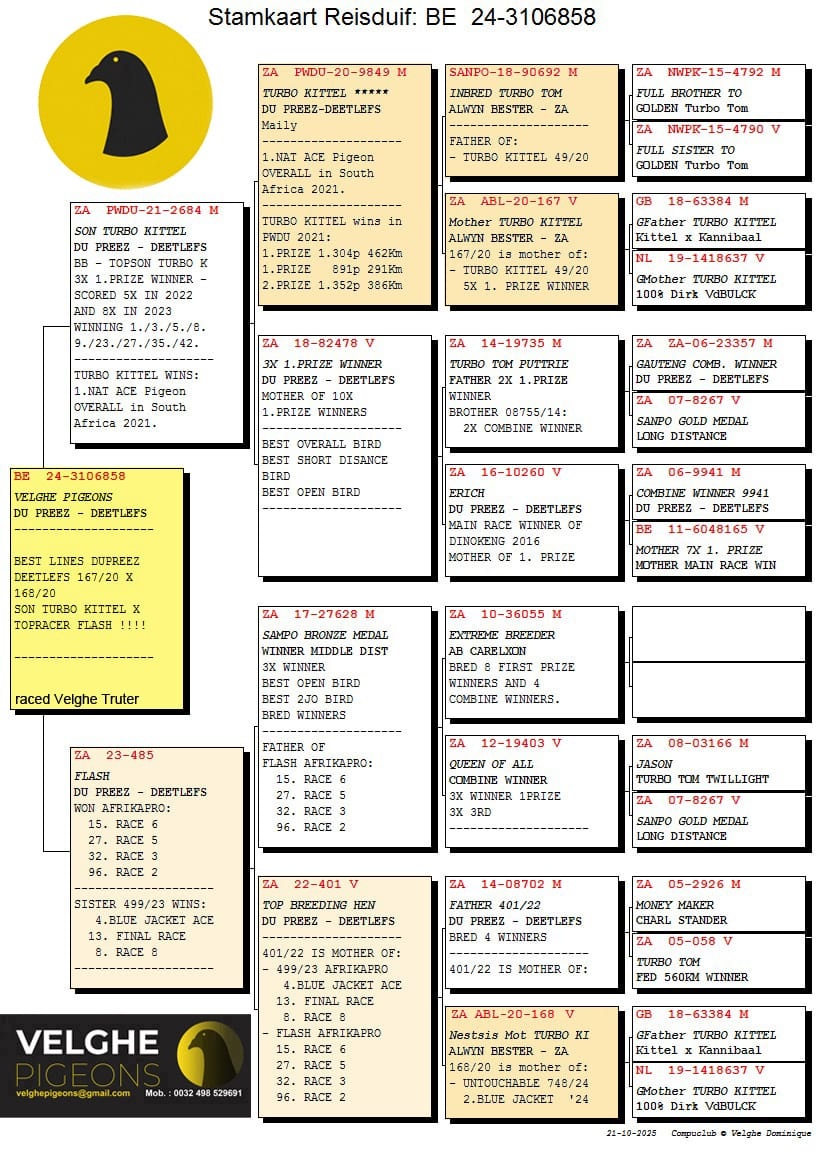 .LOT 1 INTERNATIONAL AUCTION – BE 24 3106858 – SIRE:ZA PWDU-21-2684 M. SON TURBO KITTEL DU PREEZ – DEETLEFS BB. TOP SON TURBO KITTEL 3X 1. PRIZE WINNER SCORED 5X IN 2022 AND 8X IN 2023 WINNING 1./3./5./8. 9./23./27./35./42.——–DAM:ZA 23-485.”FLASH”. DU PREEZ & DEETLEFS. SISTER 499/23 WINS: 4.BLUE JACKET ACE 13. FINAL RACE 8. RACE 8. SIRE WERE SOLD FOR R70 500.00. DAM IS ZA 22-401 V DIRECT DAUGHTER TO ABL 168. 401 WERE SOLD FOR R178 000.00. 401 IS FULL SISTER TO SIRE “BLUE MOON” WHICH WERE SOLD FOR R400 000.00.SEE PEDIGREE!!!