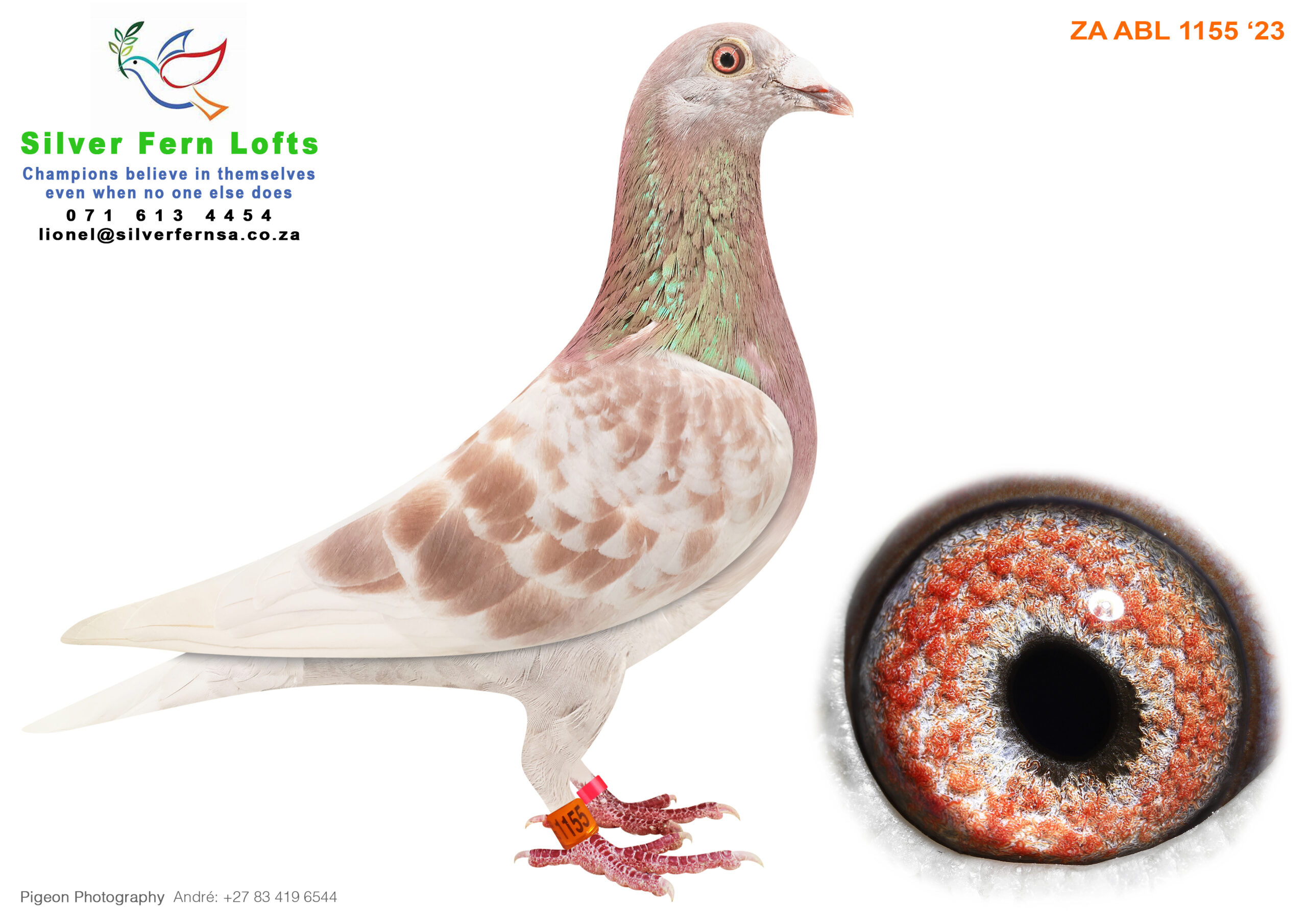 .LOT 1 KITTEL AUCTION – ZA 23 ABL 1155 -HALF BROTHER / SISTER TO “DYNASTY” (SOLD FOR R65 000.00 ON TOP PIGEON) GRAND AVERAGE WINNER DINOKENG OLR 2022.—–SIRE: 63390 GB 18 V. Alias “KITTEL BOLT”. Strain: Dirk Van Den Bulck. Color: Red Pied. Full brother to 63384, superbreeder for me. He is a very nice Kittel bred cock with a great future in the stockloft…….. DAM: 123 DV 22 01769 “123”. A.U.W DRAPA. SON “BEST KITTEL” X DAUGHTER “PORCHE 911” WHEN TO MATED TO “DAUGHTER ARMANDO”.SEE PEDIGREE!!!