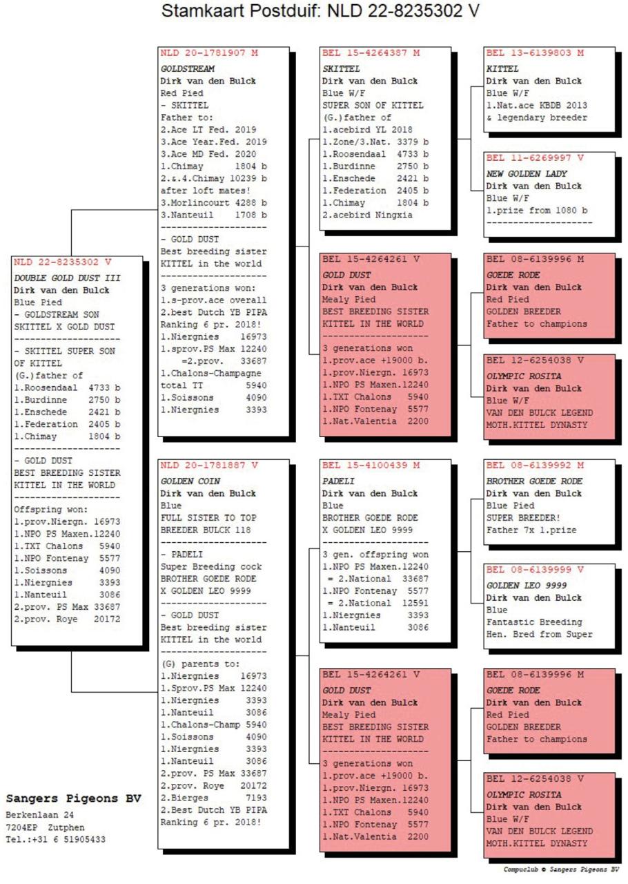 .LOT 3 KITTEL MANIA AUCTION 2 – NL 24 8621121 -SIRE:19-2146086 M RED WHITE DIAMOND 86 F.B.I Racing & Breed Red Pied (Roodbont) (HALF) SISTER TO: *BE17-4231910 “MR FOX” SIRE OF WINNING YOUNG BIRDS IN BELGIUM BEFORE MOVING TO THE UK.—————DAM:NL NL 18-1630233 V “HANOI” Sangers Pigeons Blue Pied (B1 Bont) Inbred “Broer Goede Rode” Brother Father To: Euromax 091/21 2. Federation 3,068b arrived with the winner.SEE PEDIGREE!!!