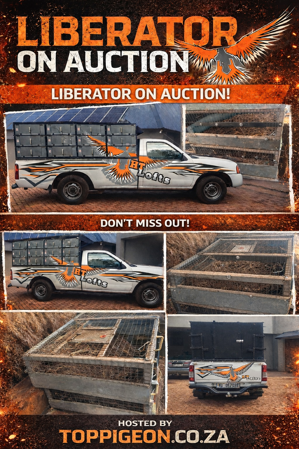 .LOT 1 LIBERATOR – LIBERATOR SIZE 2230 X 1520 X 850——-18 BASKETS – SIZES PER BASKET 700 X 700 X 250 (EACH MASKET CAN CONTAIN 20 PIGEONS)——DOOR AT THE BACK —–LIBERATOR HAS ALREADY BEEN MODIFIED TO GIVE PIGEONS WATER—–TRANSPORT FOR BUYERS ACCOUNT