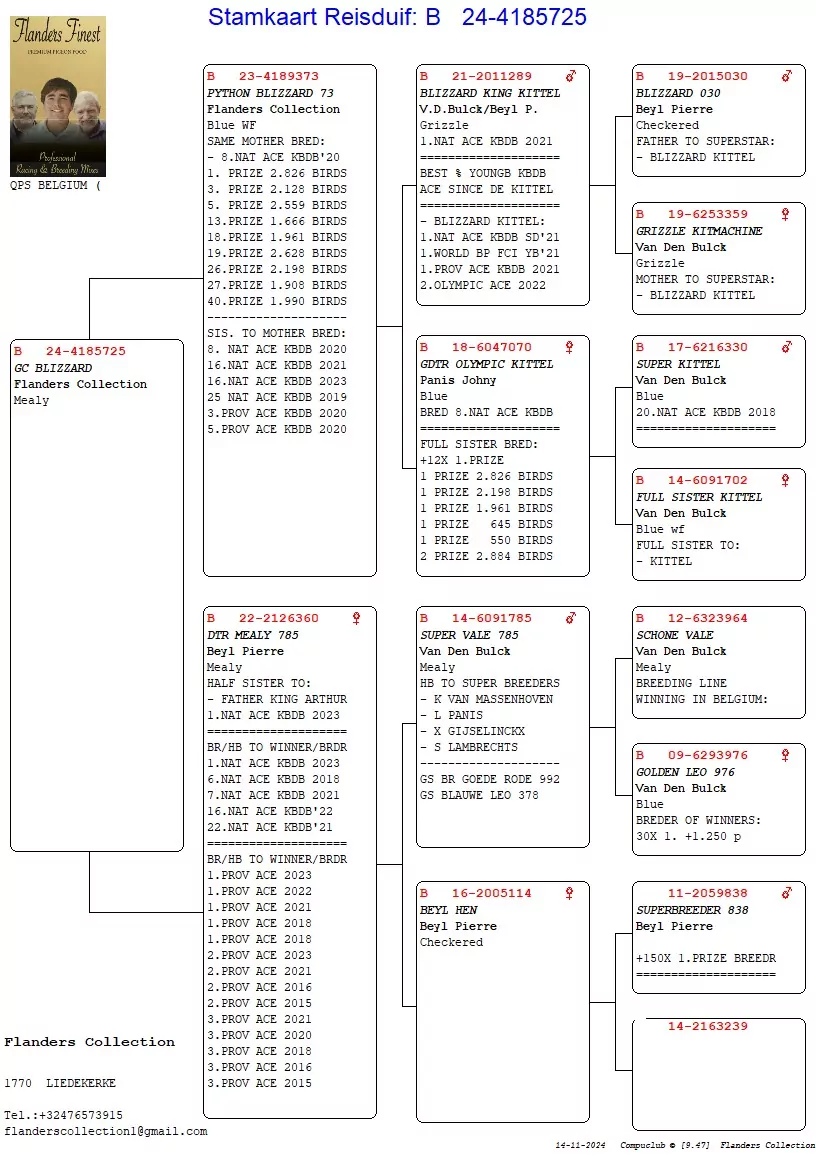.LOT 1 PIGEON PALACE – BE 24 4185725 – Mealy Cock “Vale Blizzard” he is a grandson of Blizzard King Kittel, Super Vale 785, The Beyl Hen and the granddaughter Olympic Kittel 006.———–SIRE 23-4189373 “Python Blizzard 73” he is a son of Blizzard King Kittel and his mother is a top breeding hen from Super Kittel X Sister Kittel; she has bred 8th National Ace KBDB 2020, 1st against 2,826b, 3rd 2,128b, 5th 2,559b, 13th 1,666b, 18th 1,961b, 19th 2,628b, 26th 2,198b, 27th 1,908b and 40th 1,990b. Her full sisters also bred 5th National Ace KBDB 2020, 16th National Ace KBDB 2021, 16th National Ace KBDB 2023, 25th National Ace 2019, 3rd Provincial Ace KBDB 2020 and 5th Provincial Ace KBDB 2020.————–DAM 22-2126360 from Pierre Beyl; she is a half sister to the father of King Arthur, the 1st National Ace Sprint Champion KBDB 2023. She is bred from Super Vale 785 X Beyl Hen. Super Vale 785 is a half-brother to the super breeders of Kris Van Massenhoven, L. Panis, X. Gijselinckx and S. Lambrechts. He is a grandson of Brother Goede Rode and Blauwe Leo 378. Beyl Hen is from the ‘Superbreeder of Pierre Beyl that has produced 150 X 1st prize winners.SEE PEDIGREE!!!!