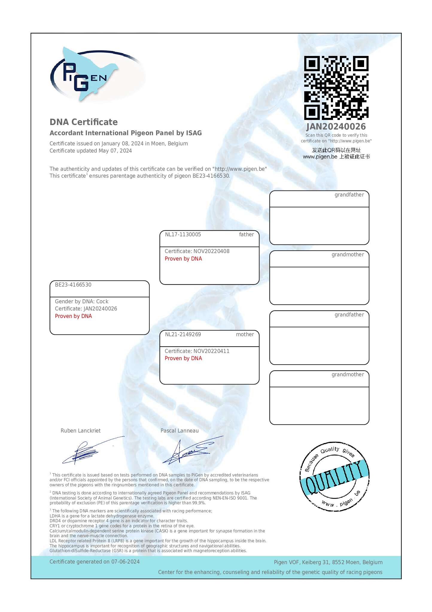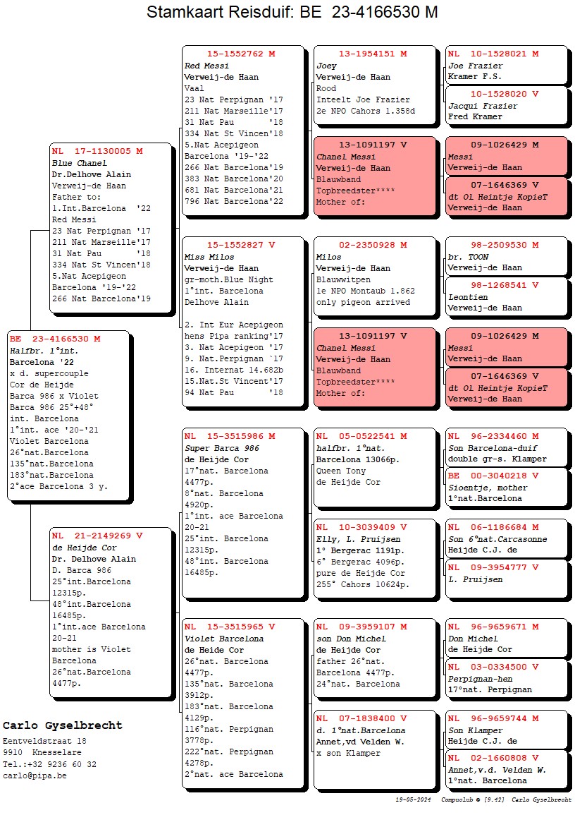 .LOT 1 SURPRISE AUCTION – BE 23 4166530 – Halfbr. 1°int. Barcelona 22———-SIRE:NL 17-1130005 M Blue Chanel Dr.Delhove Alain Verweij-de Haan.FATHER TO 1ST INTERNATIONAL BARCELONA 2022.———–DAM:NL 21-2149269 V de Heijde Cor Dr. Delhove Alain.SIRE IS 15-3515986 M Super Barca 986 de Heijde Cor 17 nat. Barcelona 4477p. 8 nat. Barcelona 4920p. 1°int. ace Barcelona.SEE PEDIGREE!!!