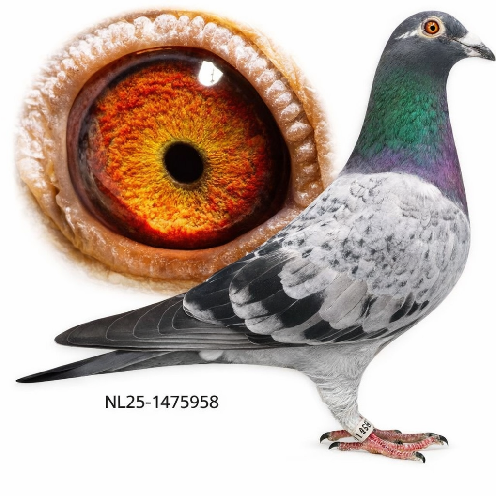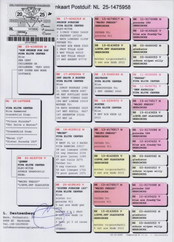LOT 10 MASTERS AUCTION – NL 25 1475958 -SIRE: BE 23-4164048 – “SON PRINCE POR 048” (PIPA Elite Center) A direct son of the outstanding “Prince Porsche”, making him a grandson of the legendary “Porsche 911” — one of the most dominant breeding lines in international pigeon racing. Bred from the very best of Geerinckx bloodlines, this cock carries the elite genetics of: “Wacko Freddy” “Porsche 911” “Son Prince Por 048” represents pure class breeding, combining proven performance with elite lineage. These lines are responsible for numerous top National, Provincial, and Ace pigeon winners worldwide. 👉 A powerful breeding cock, built on one of the most reliable and sought-after families in modern racing.————–DAM: BE 21-4153739 – “QUEEN” (PIPA Elite Center) A superb hen from elite performance bloodlines, directly bred from two of the most influential Geerinckx pigeons: “Wacko Freddy” “Lieve, DHT Gladiator” “Queen” is a double granddaughter of elite Geerinckx champions, combining speed, class, and consistency. 👉 This hen represents pure winning genetics, with a pedigree built on top National and KBDB-class bloodlines, making her an outstanding breeding hen.SEE PEDIGREE!!!!
