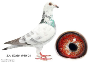 LOT 12 MASTERS AUCTION – ZA 24 EDEN 1950 -SIRE:47273 ZA 17.Bert De Ceuninck-Vanhoucke van Koppen Out of the Ceuninck pigeons. I kept him for stock and he bred winner with two differnet hens. I used his winning daughters to breed back to him. The inbred babies were crossed out again and they bred winners especially for the long distance races.———DAM:5929 ZA TRPF 20 CHARLES GRIZZLES GRIZ Bert De Ceuninck-Vanhoucke This is an inbred bird bred by Charles Carlson jr. for stock out of the De Ceuninck-Vanhoucke “Golden Pair” Olympiad Line. I bred ERPF federation winners. 1st place (Vryburg 850) 2nd place (Wolmeranstad 820 km) and 3rd place (Marydale 550 km).SEE PEDIGREE!!!!