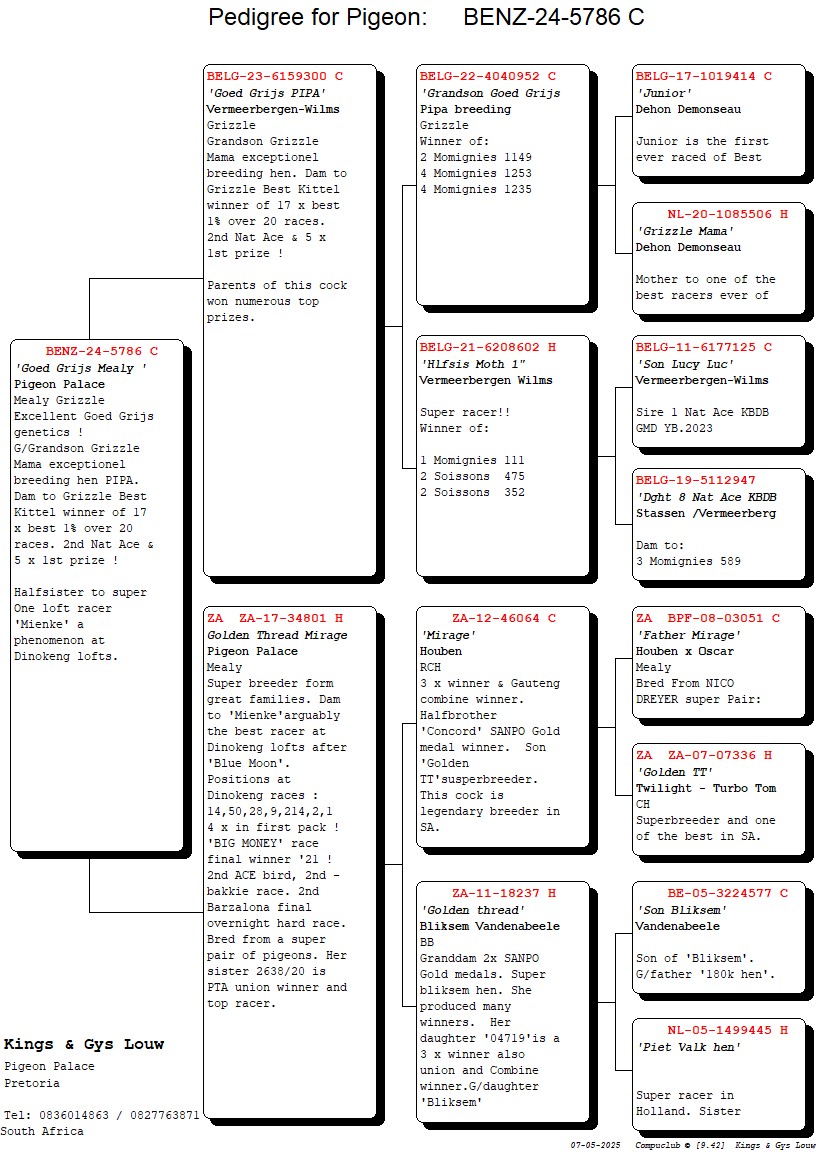 LOT 10 MID JANUARY – ZA 24 BENZ 5786 –‘Goed Grijs Mealy’ Pigeon Palace Mealy Grizzle Excellent Goed Grijs genetics.G/Grandson Grizzle Mama exceptionel breeding hen PIPA. Dam to Grizzle Best Kittel winner of 17 x best 1% over 20 races. 2nd Nat Ace & 5 x 1st prize!Halfsister to super One loft racer ‘Mienke’ a phenomenon at Dinokeng lofts.————–SIRE:BELG-23-6159300 C ‘Goed Grijs PIPA’ Vermeerbergen-Wilms.Grandson Grizzle. Mama exceptionel breeding hen. Dam to Grizzle Best Kittel winner of 17 x best 1% over 20 races. 2nd Nat Ace & 5 x 1st prize!————–DAM:ZA-17-34801 H Golden Thread Mirage Pigeon Palace. Super breeder form great families. Dam to ‘Mienke arguably the best racer at Dinokeng lofts after ‘Blue Moon’. Positions at Dinokeng races : 14,50,28,9,214,2,1 4 x in first pack! ‘BIG MONEY’ race final winner ’21 ! 2nd ACE bird, 2nd – bakkie race. 2nd Barzalona final overnight hard race. Bred from a super pair of pigeons. Her sister 2638/20 is PTA union winner and top racer.SEE PEDIGREE!!!