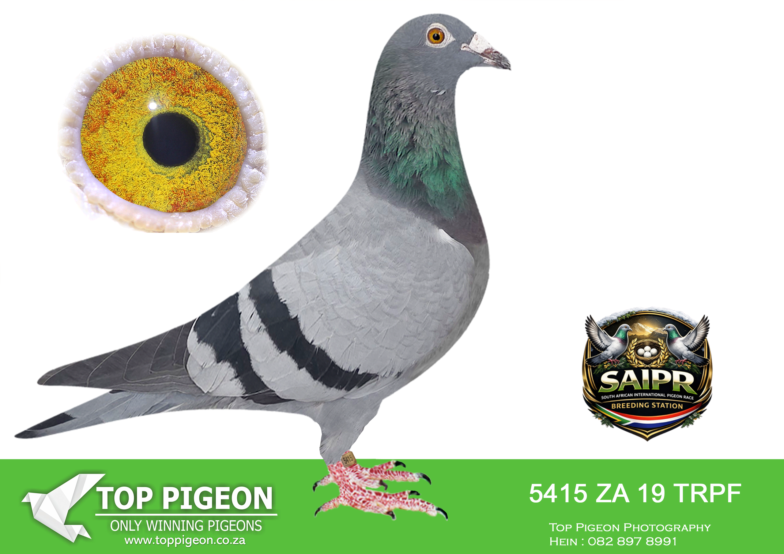 LOT 32 SAIPR BREEDING STATION – 974 ZA 20 GJT -17TH ACE BIRD CAPETOWN IOLR 2021———-SIRE: “CARELLI’S BEST” (Bak 17 Line) A top-class breeding cock built from the elite Bak 17 × Carelli Sablon foundation, known for producing consistent winners. He carries the blood of proven performers like “Mr Joy” (05891 GPU 13 ZA) – a top Verbesselt-based breeder responsible for multiple race winners, including performances in Million Euro & Taiwan races. On the dam side of the sire we find “Carelli Ace Line” (05777 GPU 13 ZA), a daughter of multiple winner breeders, reinforcing the Carelli Sablon strength. This cock is tightly bred to a powerful combination of De Rauw Sablon, Aelbrecht, and Bak 17, with influence from “Lucky Freddy” and “Marcelina”, both known for producing OLR super racers and high-performing progeny.————DAM: Direct KAASBOER Dynasty (Nr 1 Hen Line) An exceptional hen bred from the very best Kaasboer blood in South Africa, directly linked to the legendary “Gold Gouda P1600189” and “Kiran P1600177”. “Gold Gouda” – Nr 1 Kaasboer cock in SA, sire to a 7x winner, 3rd SAPIR, and multiple top performers. “Kiran” – Nr 1 Kaasboer hen in SA, dam of 7-time winners, SAPIR performers, and several proven breeders. This hen originates from the famous MC Hansen Kaasboer stud (Denmark), combining “Koe Oog” and “Bon Duivin”, two of the most influential Kaasboer pigeons ever imported. 👉 A powerhouse dam line known for consistency, durability, and top-level winning ability across generations.SEE PEDIGREE!!!