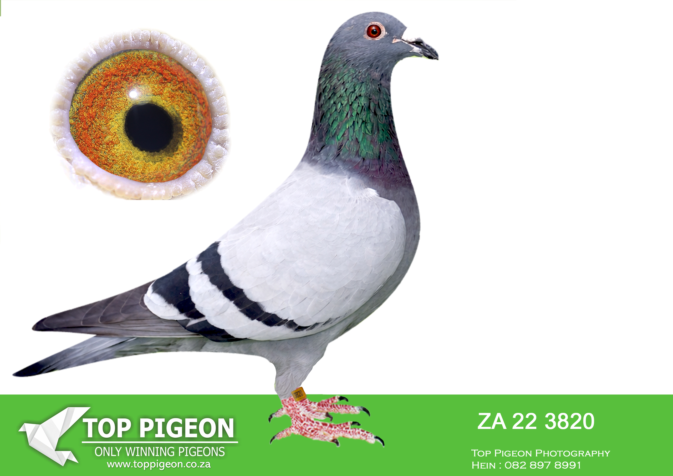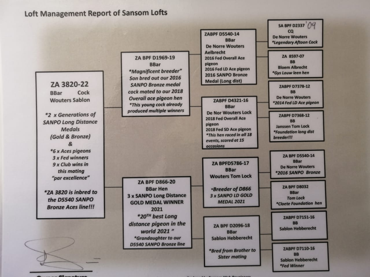 LOT 10 WACKY WEDNESDAY – ZA 22 3820 (C) – WOUTERS SABLON – BRED FROM TWO GENERATIONS OF SANPO LONG DISTANCE MEDALS – 6X ACE PIGEONS – 3X FED WINNERS – 9X CLUB WINS IN THIS MATING “PAR EXCELLENCE” – ZA 3820 IS INBRED TO D5540 SANPO BRONZE ACES LINE.SEE PEDIGREE!!!!