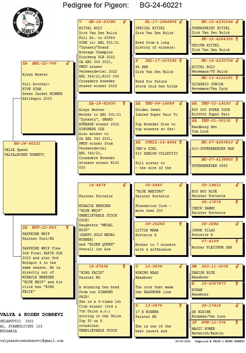 LOT 11 AFRIKAPRO AUCTION 2 – Valya & Rosen Dobrevi Single-BULGARIA-24-60221 -22ND BLUE JACKET——-SIRE:ZA 22 ABL 769 .Alias “BROTHER 5 STAR” Strain: ALWYN BESTER BROTHER “5 STAR” ZA22 ABL 769 FULL BROTHER TO: “5 STAR” GREEN JACKET WINNER AFRIKAPRO 2023 ZA21 ABL 343 “DYNASTY ” 1ST ACE DINOKENG OLR 2022 ZA21 ABL 344 PWDU UNION WINNER VERKEERDEVLEI 2020 & CRUSADERS BREEDERSTAKES R100,OOO WINNER.———–DAM: ZA 22 KPU 853 .Alias “SAPHIRE WHIP” Strain: PAINTERS “SAPHIRE WHIP” ZA22 KPU 853 FLEW 3RD FINAL SAIPR 2023 AND ALSO 3RD HOTSPOT 4 SHE IS DIRECTLY OF THE “BLUE WHIP” WITH HIS CLICK HEN “RING FACIE” THIS PEDIGREE IS FULL OF THE BEST THE PAINTERS GENETIC’S 17 X WINNER DAM TO MISS MEDALS.SEE PEDIGREE!!!