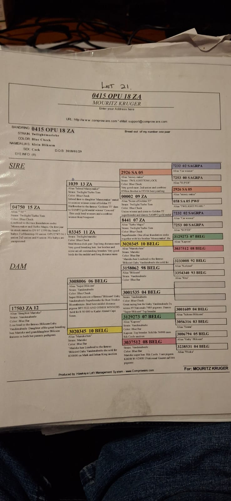 LOT 21 GLOBAL AUCTION – ZA 22 ZWDK 0319 -SIRE:ZA-2016-PWFD-1503 Desmet/Lambrecht/Romein Red BRED UNION WINNER!! His son 0319 won the PWDU Sprint Union from Winburg. His daughter ZWDK 14 ‘2021 became a double winner and is now at stock.—————DAM:ZA-2014-02697 “02697” Twilight/Powell/Turbo Tom Blue white flights A champion breeding hen. HAS BRED WINNERS like 4203 who won the PWF Derby in 2018 and also won in 2019 – 4203 in turn has bred me a double winner herself. Also bred a Union winner 0319 who won the PWDU Sprint from Winburg 320km. 02697 is the full sister of my basis cock 02657. Their full brother 03320 became a double winner for Die Waldecks and then in turn bred a triple winner. This is the best blood still available of the pigeons of Charl Stander.SEE PEDIGREE!!!
