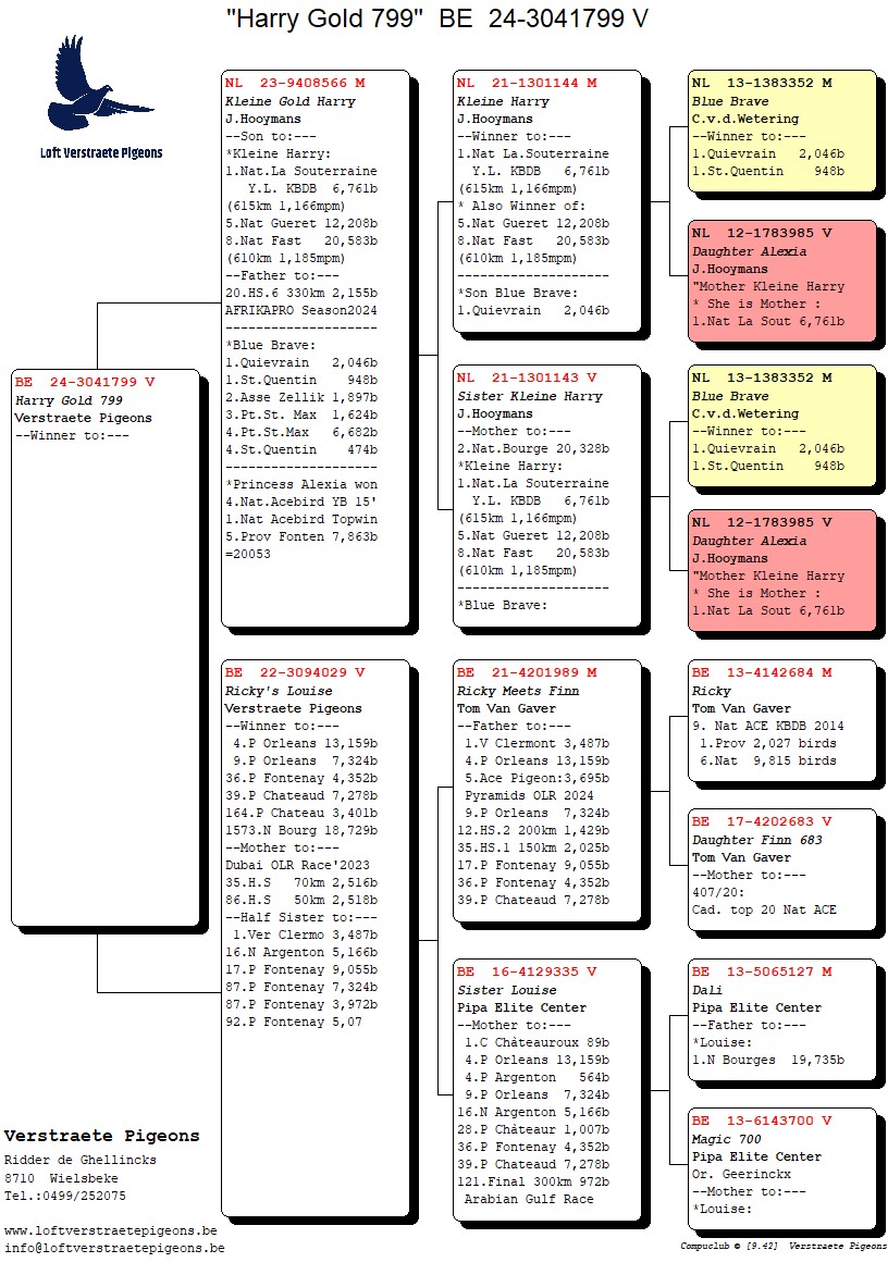 .LOT 2 LOFT VERSTRAETE – BE 25 3040193 -SIRE: NL 22-8560846 – “Double Harry” (J. Hooymans) “Double Harry” is a direct son of the legendary Harry bloodline from J. Hooymans, one of the most influential long-distance racing families in the world. This cock is bred from “Harry-Birdy 62”, a proven performer with multiple top final race results including 3rd Final VWCPR 2018, 4th Enduro VWCPR 2021, and 5th Final PIPR 2018/2019. The line traces directly back to “Harry”, the world-famous Hooymans champion, winner of 1st Blois against 37,728 birds. This bloodline is renowned for exceptional endurance, consistency, and international one-loft race success.—————DAM: BE 23-3110105 – “Bisty’s Contador” (Verschot Joel) “Bisty’s Contador” is a direct daughter of the famous “Contador” breeding line from Joel Verschot, a family responsible for numerous national winners and top international results. Her sire “Bisty” (BE17-3031152) is a proven racer with outstanding performances including: 1st N. Valence – 6,061 birds , 1st P. Valence – 554 birds , 47th National Angoulême – 1,616 birds , 72nd National Angoulême – 5,030 birds , 93rd National Tours – 5,864 birds.SEE PEDIGREE!!!!