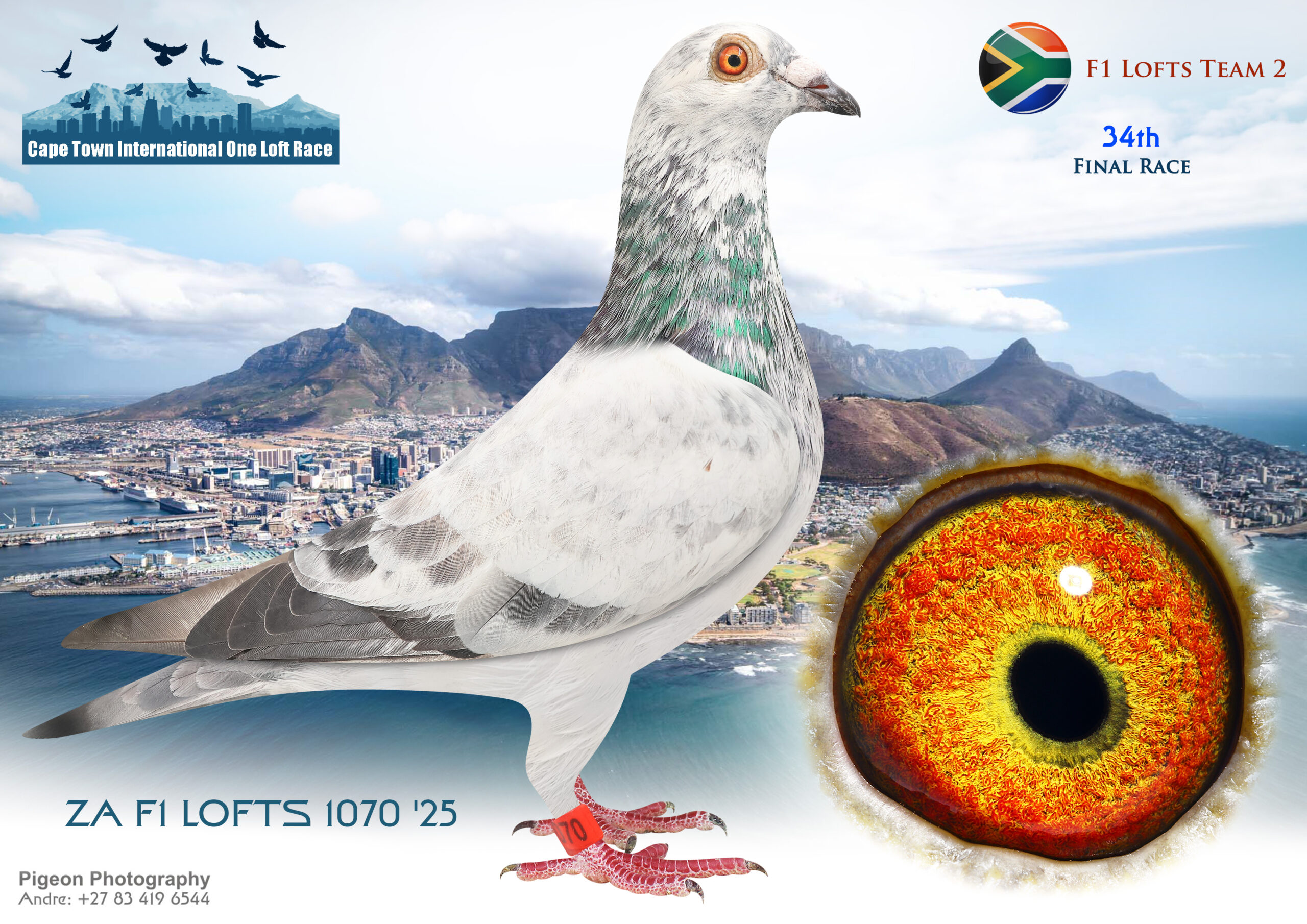 .LOT 5 CAPETOWN LOFTS – F1 Lofts Team 2-ZA-F1-LOFTS-25-1075*** -5TH FINAL RACE WINNING R20 000.00 , 3RD ACE BIRD WINNING R15 000.00 , 6TH HOTSPOT 4———–SIRE:ZA-2019-OOA-216 Dieplaagte & Sterkfontein Lofts Blue Full brother to: • 2e Combine PTA Leeu Gamka 996km. Half-brother to “Skywalker” the father of: ZA 25 OERF 2031 • 1e Bakkie Race Karoo Million 855km 2025. • 14e Ace Bird Overall Karoo Million 2025. Half-brother to “Dero’s Mix” the father of: • 4e Final Central Prov. Lofts 2024. Grandfather to “Eighty” (Leohan Bekker) • 12e Ace Cape Town Int. 2024. • 11e Final Cape Town Int. 2024. • 2e Hotspot 2 Cape Town Int. 2024. =====================DAM:ZA-2019-BDUD-1695 Du Plooy Family Lofts.The bloodline is responsible for countless winners in One Loft Racing, Her father’s full brother bred the grandfather to 5e Final Cape Town Int. 2025 for RMG Racing.SEE PEDIGREE!!!!
