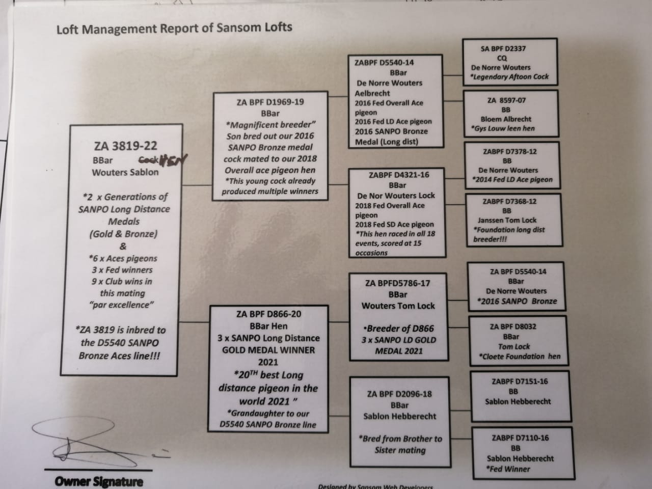LOT 10 WACKY WEDNESDAY – ZA 22 3820 (C) – WOUTERS SABLON – BRED FROM TWO GENERATIONS OF SANPO LONG DISTANCE MEDALS – 6X ACE PIGEONS – 3X FED WINNERS – 9X CLUB WINS IN THIS MATING “PAR EXCELLENCE” – ZA 3820 IS INBRED TO D5540 SANPO BRONZE ACES LINE.SEE PEDIGREE!!!!
