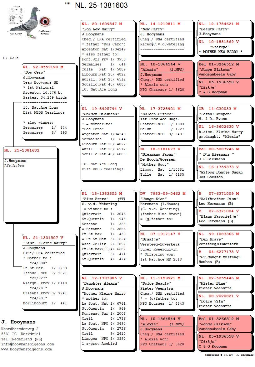 LOT 13 AfrikaPro Auction 2B – Team Hooymans.BE II – NL-25-1381603 -SIRE:NL. 22-8559120 M “Dos Cero” J.Hooymans Team Hooymans BE 1st National Argenton 16.576 b. Fastest 34.249 birds.———–DAM:NL. 21-1301507 V “Sist. Kleine Harry” J.Hooymans Blue/ DNA certified.SEE PEDIGREE!!!