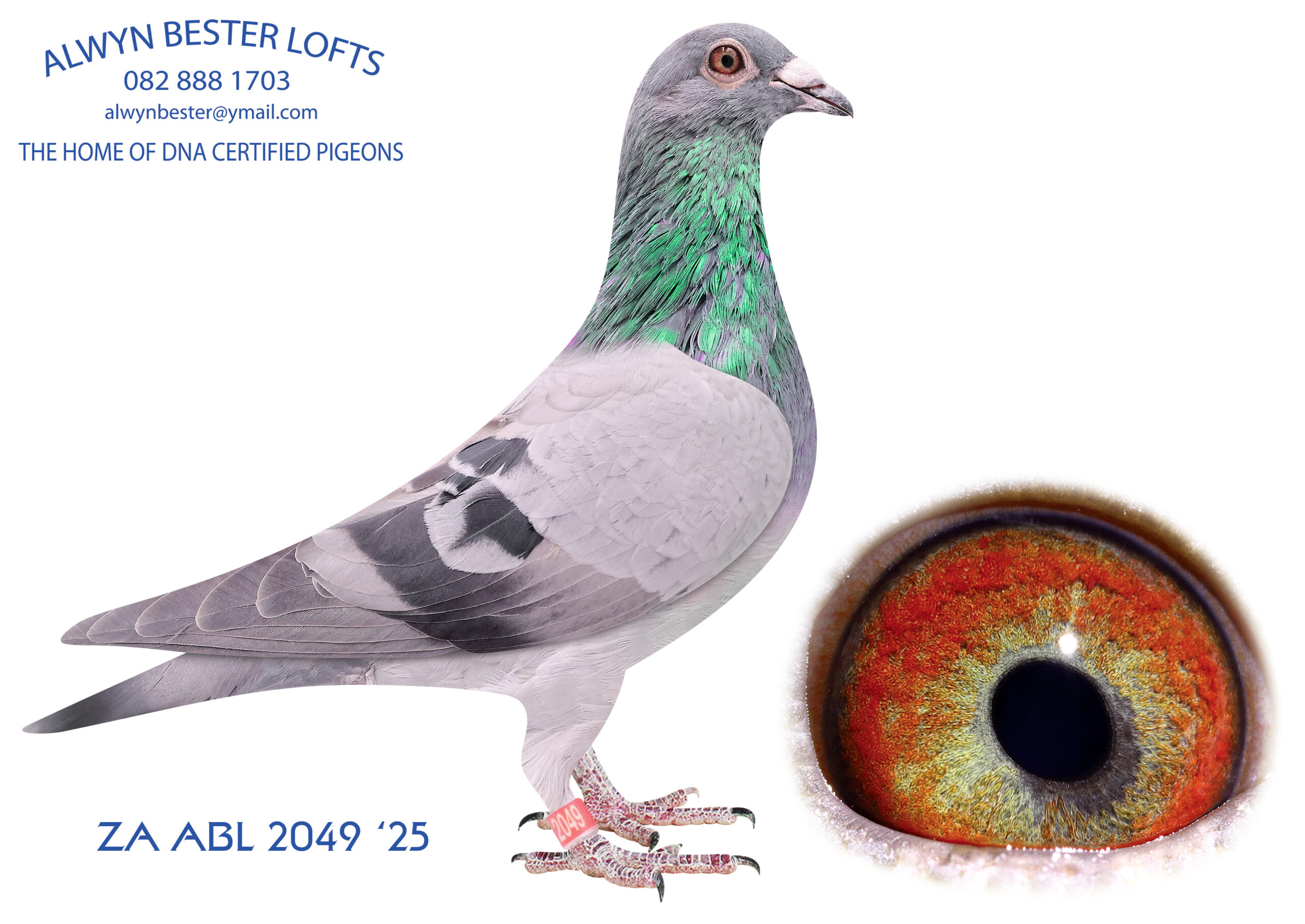 LOT 13 ANDRE ERASMUS “TSUNAMI LOFTS” – 2049 ABL ZA 25 -HALF SIBLING WERE SOLD FOR R86 000.00 ON TOPPIGEON———SIRE: 6014591 BE 20.Strain: Dirk Van Den Bulck Color: BLUE BAR PIED Bred from a full brother to sister mating from “Olympic Rosita”, the mother to “KITTEL”. Bred ZA ABL 923 2023, Best yearling Pretoria Union 2024.————DAM:9508740 NL 23 .Alias “PORSCHE 740” Strain: Pipa Elite Center Color: Blue Bar Grandchild from PORSCHE 911 and his full sisters and brother, MACAN. Very inbred back to WACKO FREDDY and LIEVE..SEE PEDIGREE!!!