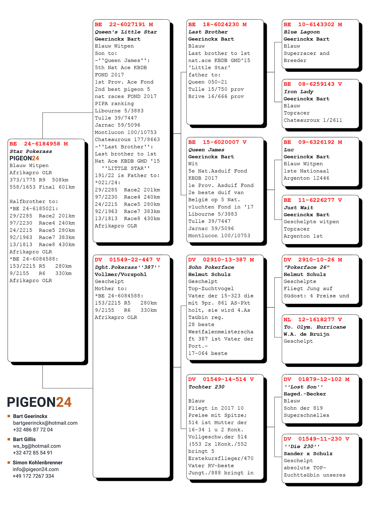 LOT 14 AFRIKAPRO AUCTION 1 – PIGEON24-BE-24-6184958 -SIRE:BE 22-6027191 M Queen’s Little Star Geerinckx Bart Blauw Witpen.————DAM:DV 01549-22-447 V Dght.Pokerass’ ‘387” Vollmer/Vorspohl Geschelpt Mother to: *BE 24-6084588: 153/2215 R5 280km 9/2155 R6 Afrikapro OLR.SEE PEDIGREE!!!