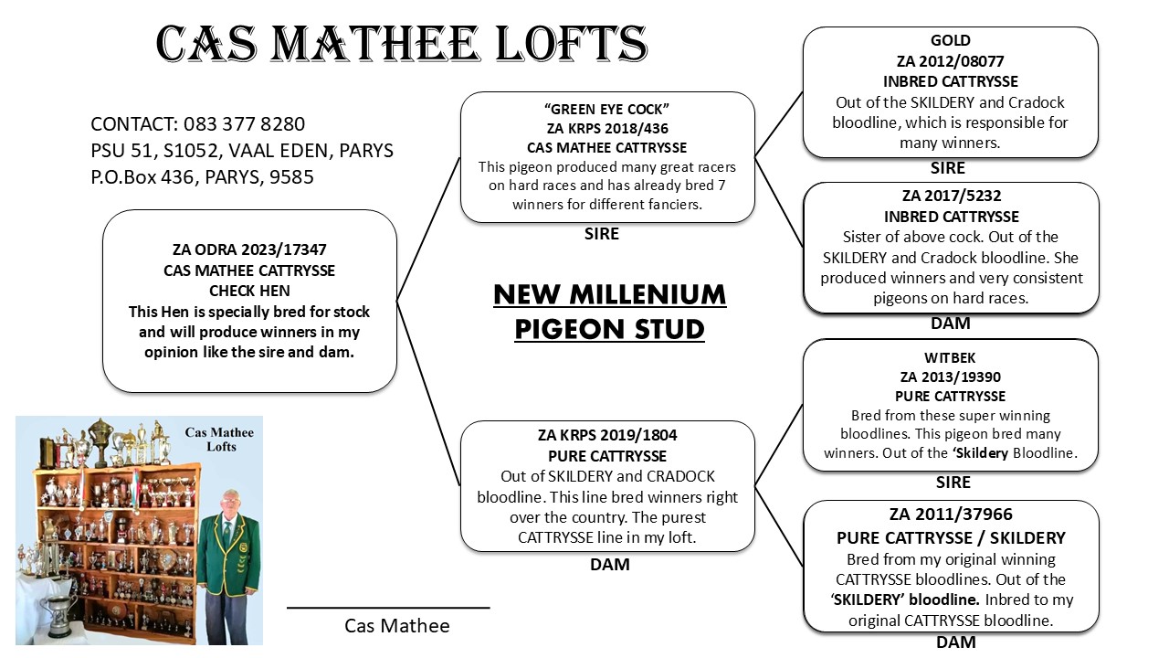 .LOT 1 ANDRE ERASMUS “TSUNAMI LOFTS” 2 – ZA 25 KWU 405 -SIRE: The sire side is heavily built on elite Dirk Van Den Bulck “Kittel” bloodlines, one of the most dominant sprint families in modern pigeon racing. This line includes direct connections to legends such as “Kittel”, “Golden Kittel”, “Olympic Rosita”, and “Goede Rode”. The sire is closely related to top performers and proven breeders, including full brothers to Kittel and pigeons that have produced multiple national ace birds and winners. With such a concentration of winning genetics, this cock offers explosive speed, consistency, and exceptional breeding potential.————DAM: The dam is a direct daughter of the world-famous “Kittel Bolt” (63390 GB 18 V) — one of the most exciting modern representatives of the Kittel dynasty. This makes her genetically loaded with proven winning ability. On the dam’s side, the pedigree is reinforced with more top Kittel blood, including lines from “Best Kittel,” “Olympic Rosita,” and “Goede Rode.” The family has a long history of producing national ace pigeons and top race winners. This hen combines top racing performance genes with elite breeding strength, making her an outstanding foundation female.SEE PEDIGREE!!!!