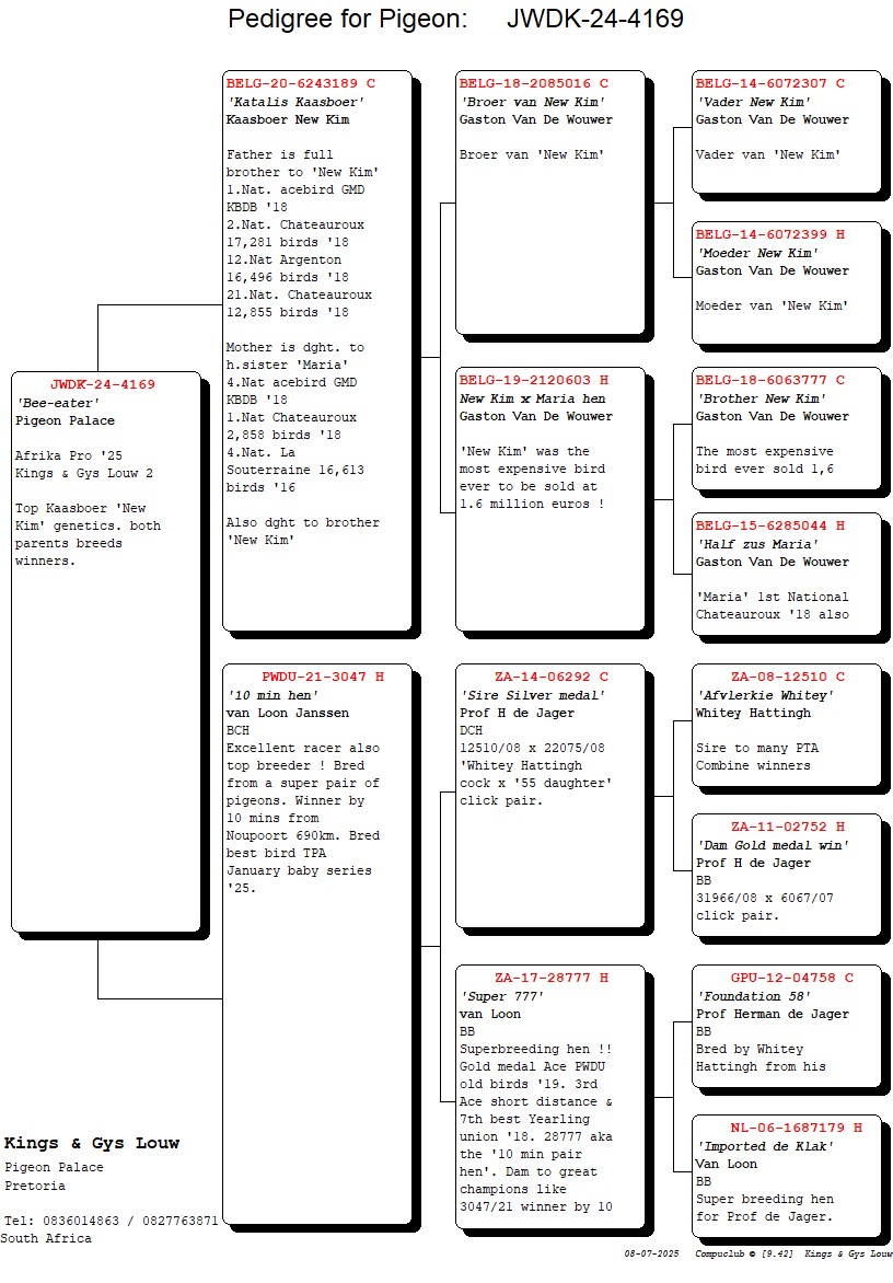 LOT 15 AfrikaPro Auction 2B – Kings & Gys Louw 2 – ZA-24-JWDK-4169 -SIRE: BELG 20 6243189 “KATALIS NEW KIM”. KAASBOER. BROTHER X NIECE NEW KIM BOUGHT FROM PIPA. INBRED BROTHER AND NIECE TO 1ST NAT ACE BIRD “NEW KIM”. FATHER IS FULL BROTHER TO NEW KIM.———DAM:PWDU-21-3047 H ’10 min hen’ van Loon Janssen.Excellent racer also top breeder! Bred from a super pair of pigeons. Winner by 10 mins from Noupoort 690km. Bred best bird TPA January baby series 25.SEE PEDIGREE!!!